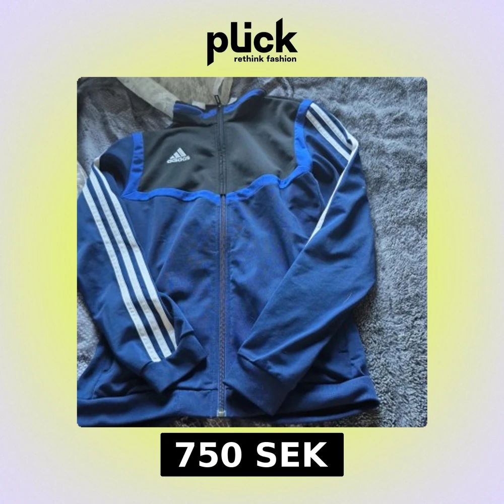 Snygg blå och svart vindjacka från Adidas med klassiska vita ränder längs ärmarna och logga på bröstet. Jackan har hel dragkedja framtill, ribbade muddar och sportig look. Perfekt för dig som gillar streetstyle och sportmode. Original priset är 1300kr.