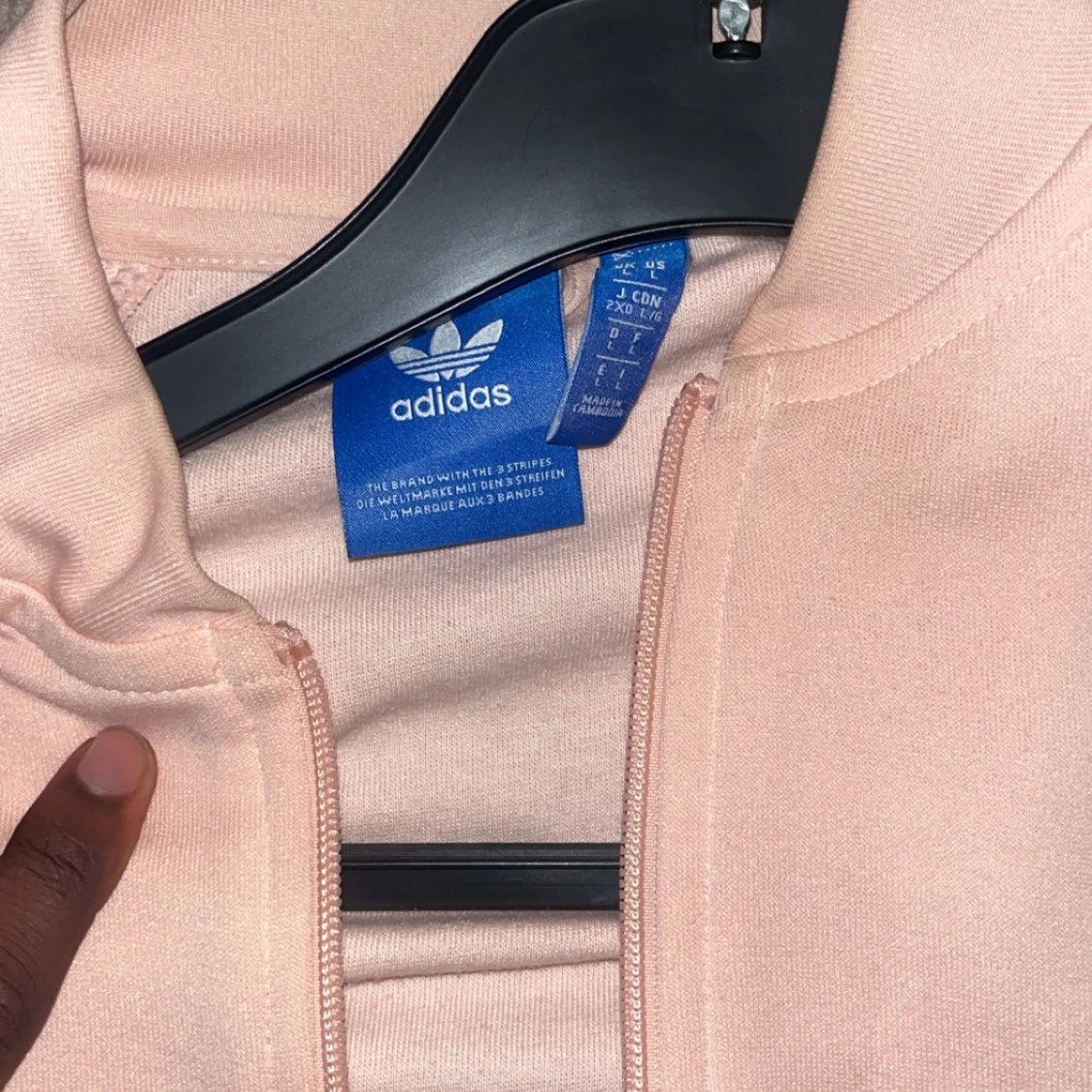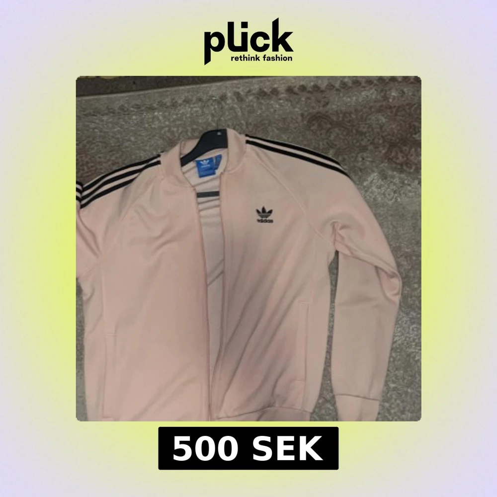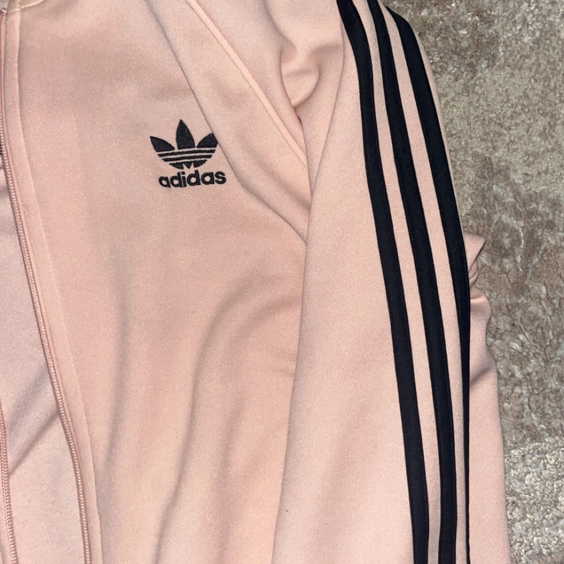 Säljer en ljusrosa Adidas track jacket med svarta ränder på ärmarna och Adidas-logga på bröstet. Jackan har dragkedja framtill och är långärmad. Klassisk sportig stil och bekväm passform.