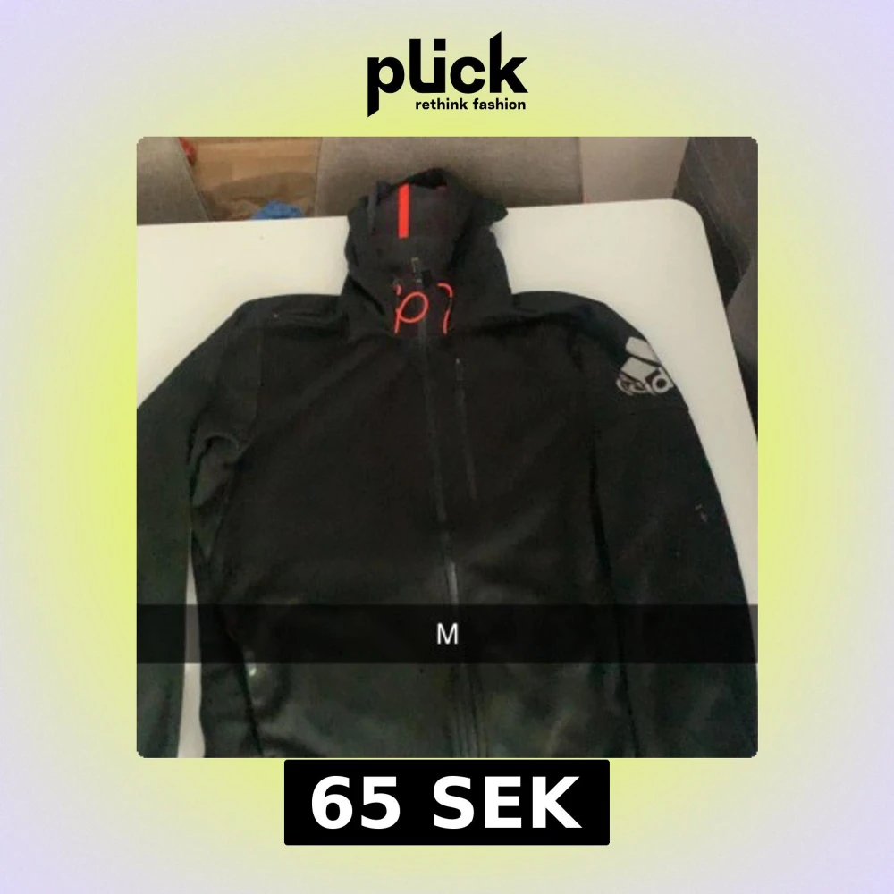 Säljer en svart vindjacka från Adidas med huva och dragkedja framtill. Jackan har röda detaljer på huvan och snörning, samt Adidas-logga på ena ärmen. Perfekt för dig som gillar sportig stil och vill ha något snyggt och funktionellt.