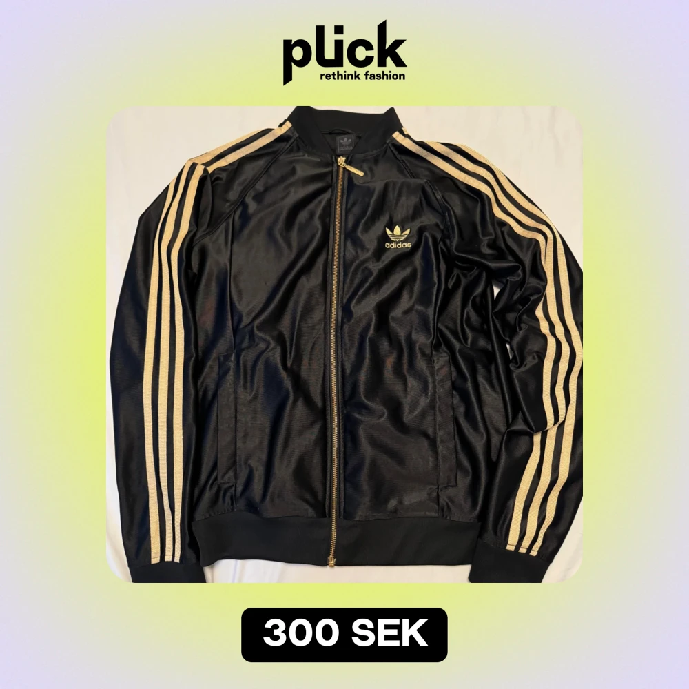 Säljer en snygg svart Adidas jacka med guldiga ränder längs ärmarna. Den har en dragkedja fram och det klassiska Adidas-loggan på bröstet. Perfekt för både träning och vardag. Jackan är i mycket bra skick och passar perfekt till höst och vår. Ps liten i storlek!