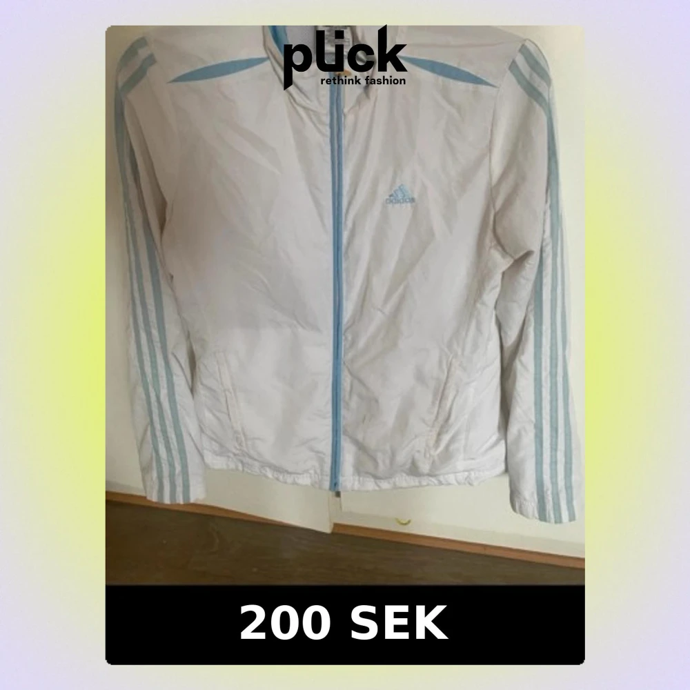 Säljer en fräsch vit vindjacka från Adidas med ljusblå ränder längs ärmarna och blå logga på bröstet. Jackan har dragkedja framtill och två fickor. Perfekt för dig som gillar sportig stil och vill ha något lätt och snyggt till vardagen.