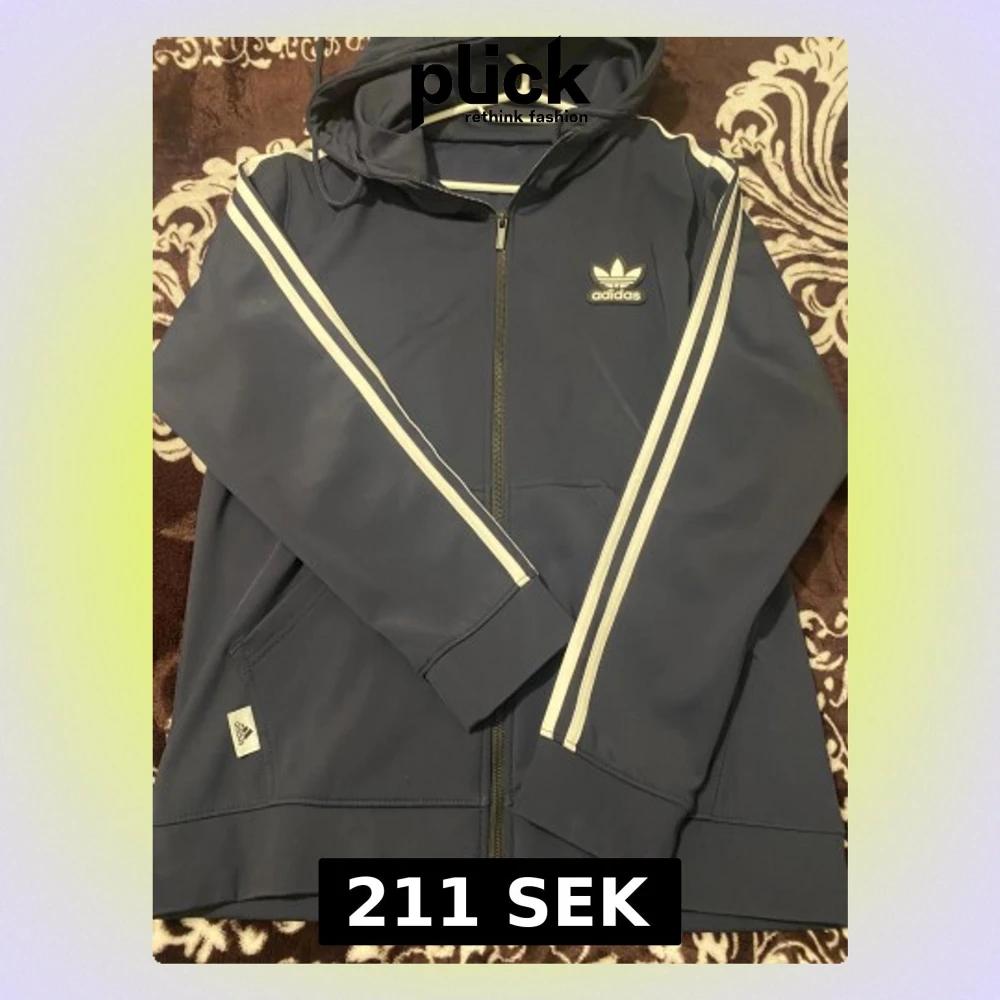 Snygg marinblå vindjacka från Adidas med klassiska vita ränder längs ärmarna och Adidas logga på bröstet. Jackan har huva, dragkedja framtill och praktiska fickor. Perfekt för dig som gillar sportig stil och streetwear.