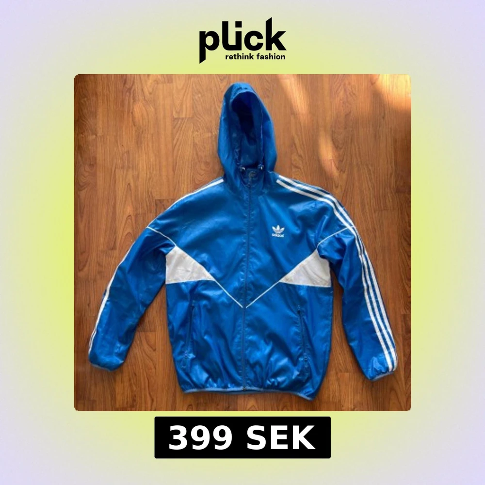 Säljer en blå vindjacka från Adidas med klassiska vita ränder längs ärmarna och vita detaljer framtill. Jackan har huva med dragsko, hel dragkedja och två fickor med dragkedja. Materialet är lätt och syntetiskt, perfekt för blåsiga dagar.