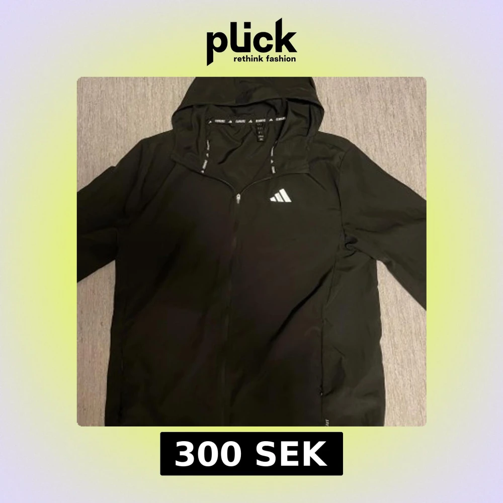Svart vindjacka från Adidas med huva och hel dragkedja. Jackan har stora vita Adidas-loggor både fram och bak, samt diskreta fickor på sidorna. Perfekt för löpning, tillverkad i lätt polyester.