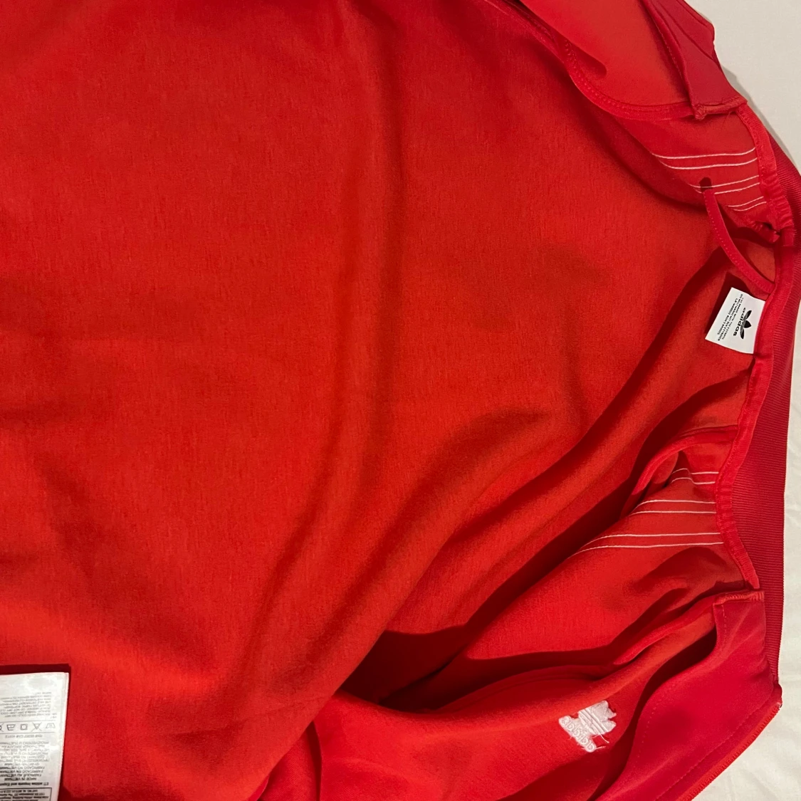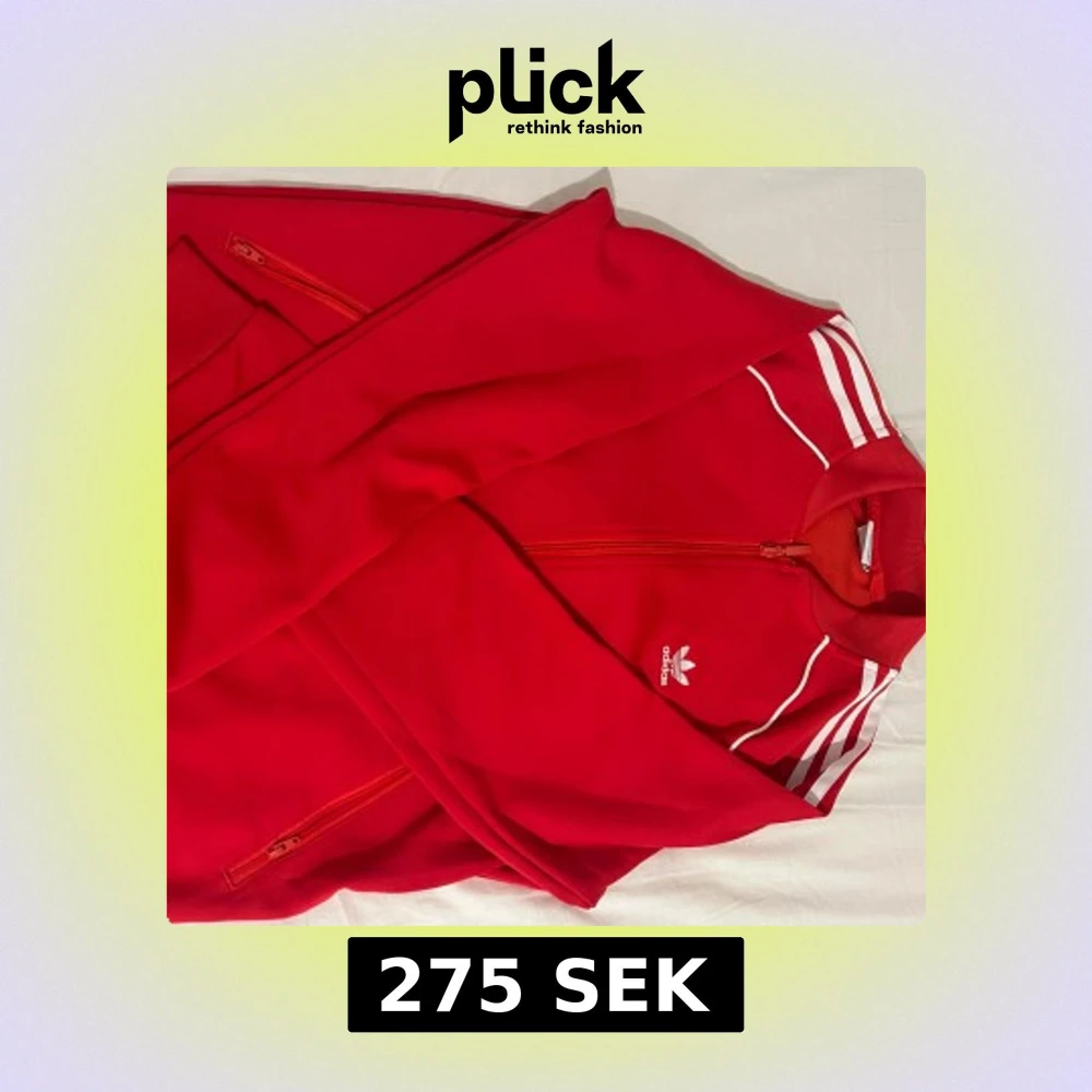 Säljer en fin röd träningsjacka från Adidas med klassiska vita ränder på axlarna. Storlek S och är i god skick.