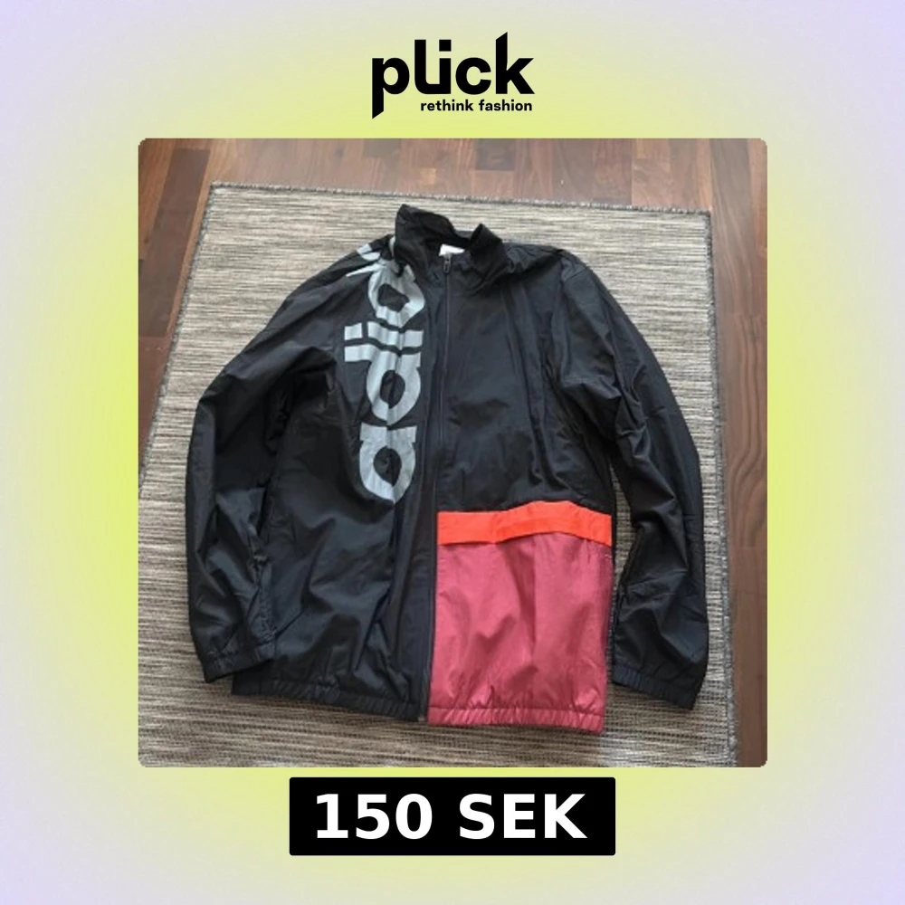 Snygg svart vindjacka från Adidas med stor logga på framsidan. Jackan har en dragkedja och en cool färgblockdesign med inslag av rött och orange. Perfekt för en sportig look.