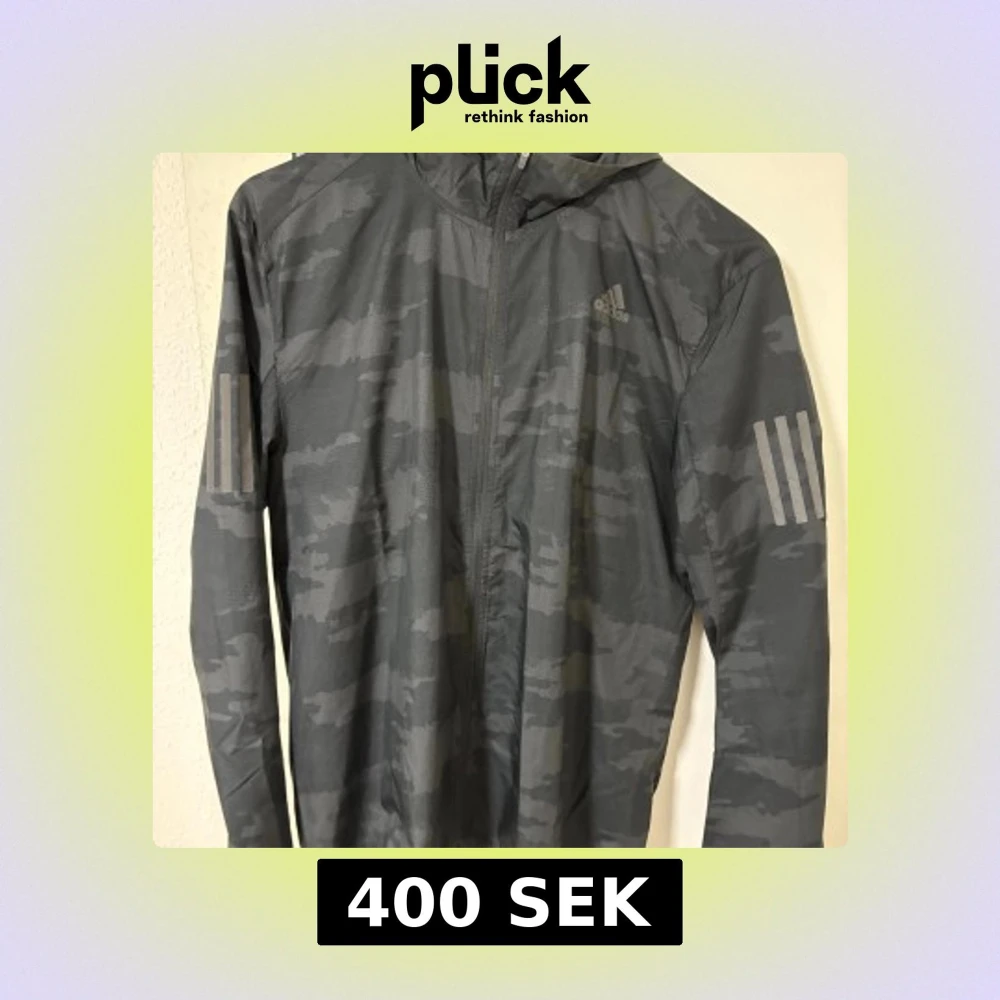 Svart och grå vindjacka från Adidas i camomönster. Jackan har huva, hel dragkedja framtill och reflekterande ränder på ärmarna. Storlek S men passar M