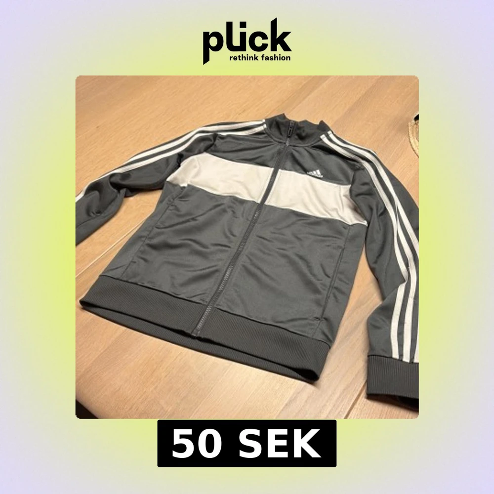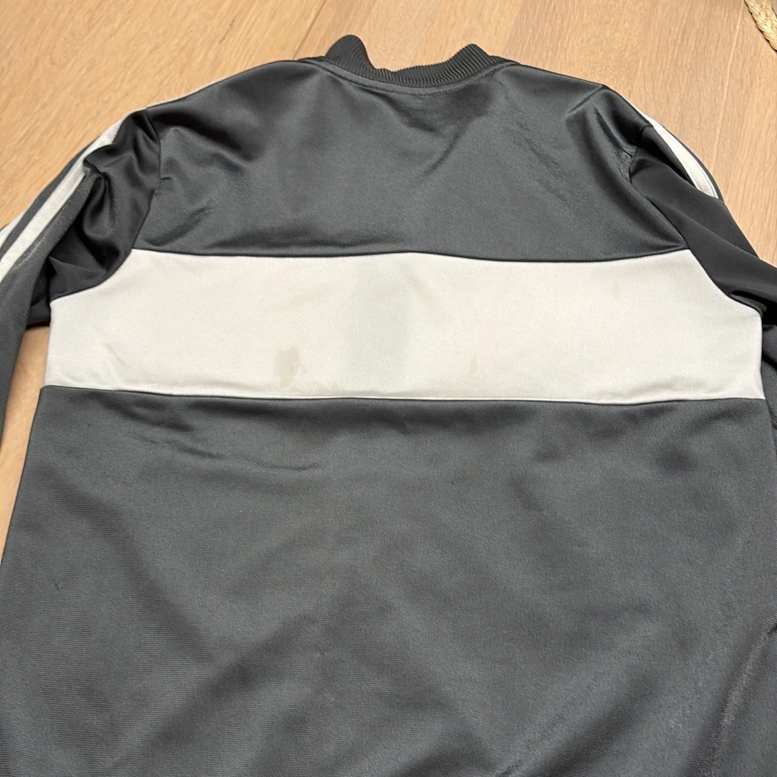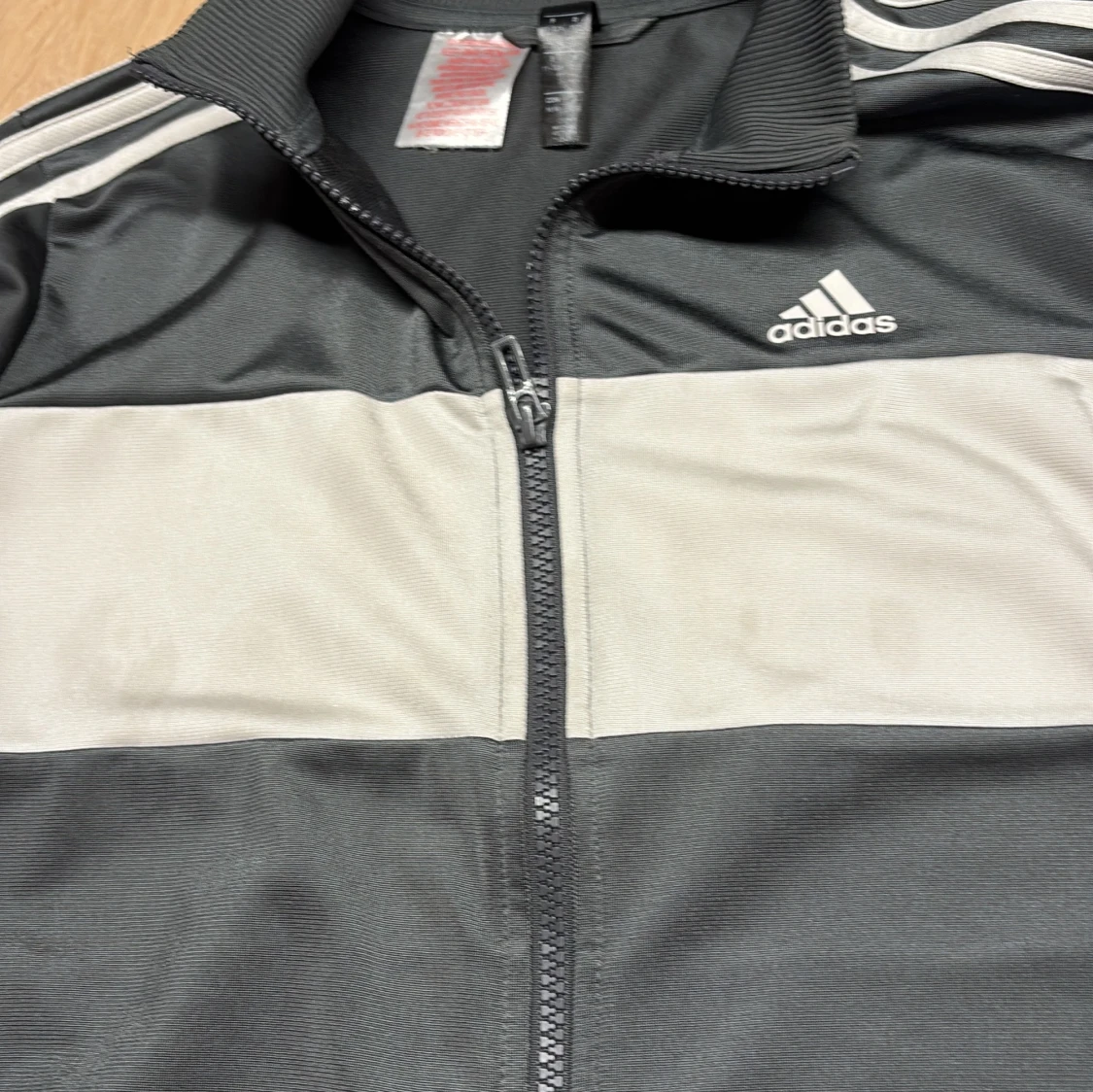 Snygg Adidas track jacket i grått med bred vit panel över bröstet och ryggen. Klassiska vita ränder längs ärmarna och Adidas-logga på bröstet. Jackan har hel dragkedja, ribbade muddar och är tillverkad i mjuk polyester.Fläckar förekommer på det vita men syns bara om man tittar noga