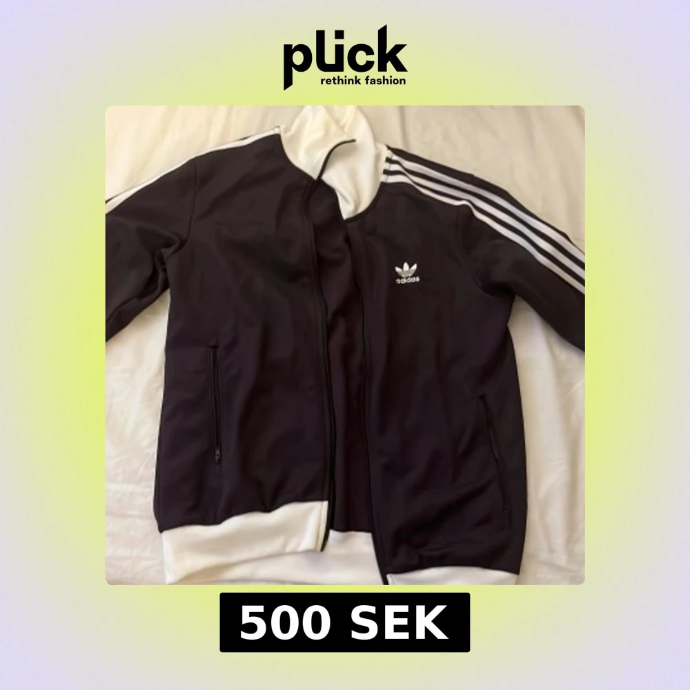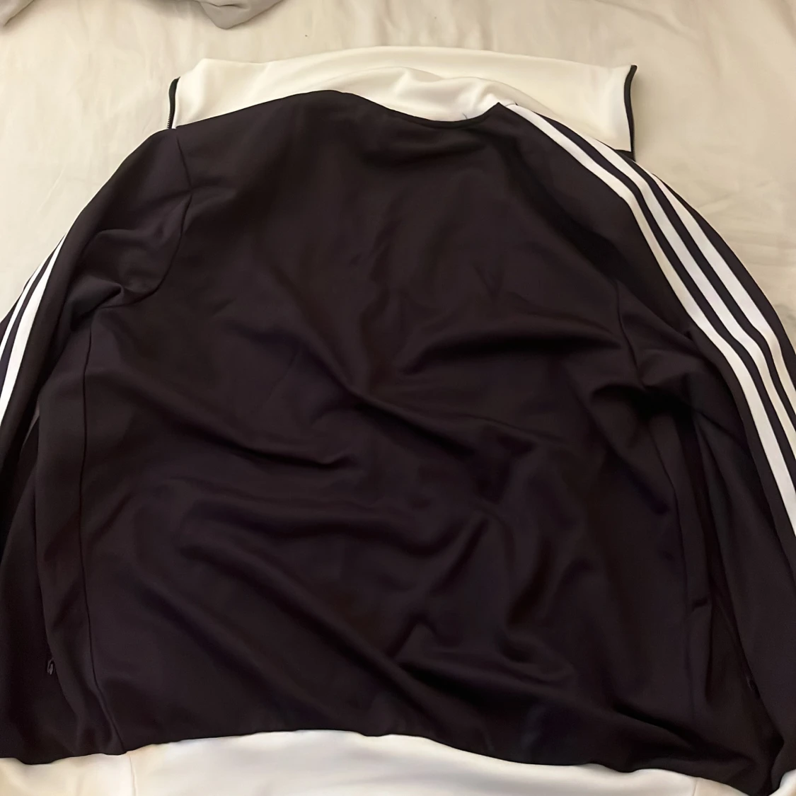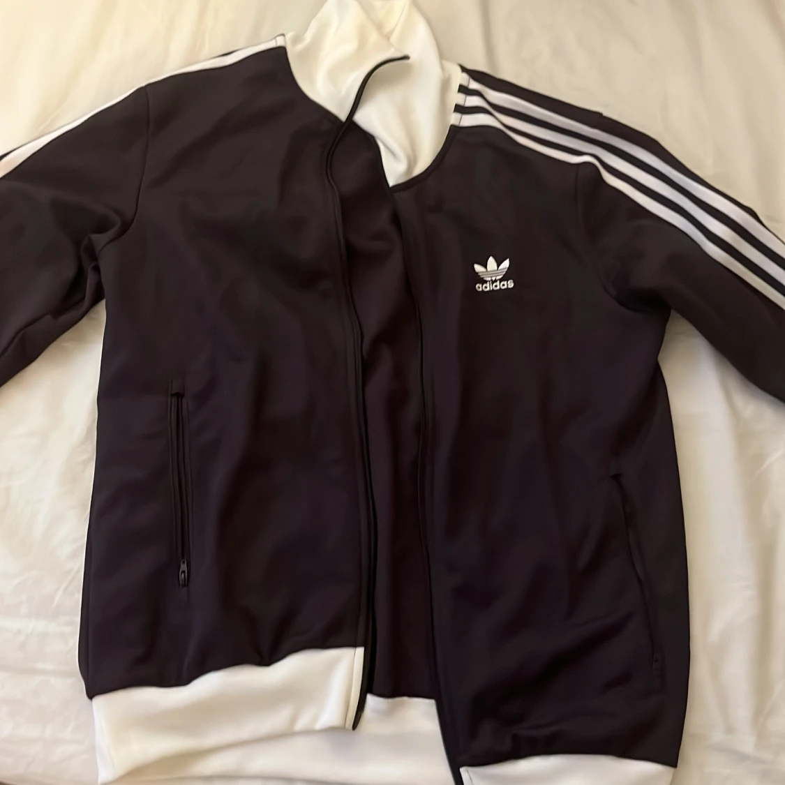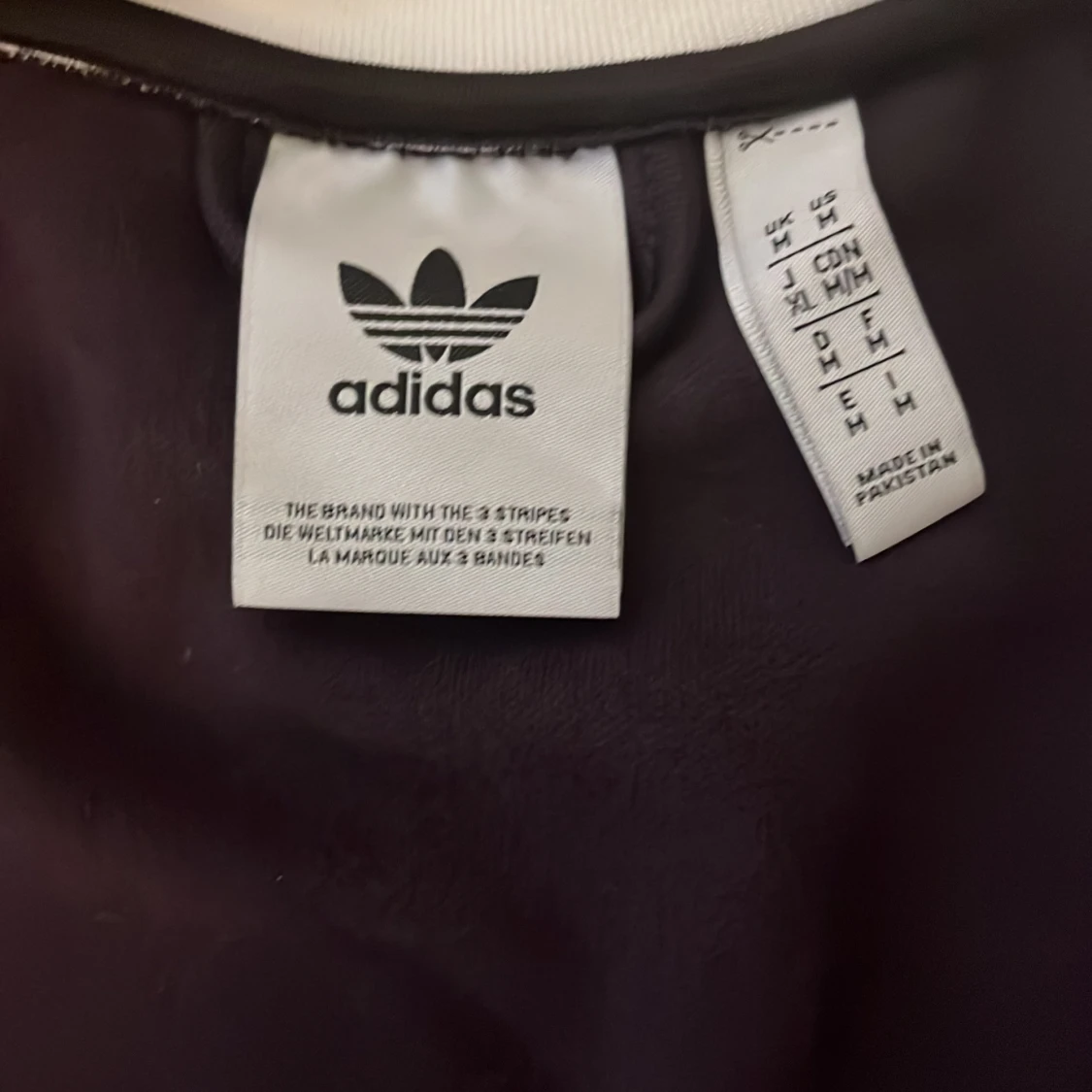 Mörklila/svart Adidas track jacket med klassiska vita ränder längs ärmarna, vit krage och muddar. Jackan har dragkedja framtill, två fickor med dragkedja och Adidas logga på bröstet. Tillverkad i polyester för en sportig och bekväm känsla.