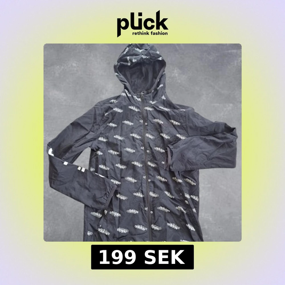 Svart vindjacka från Adidas med hel dragkedja och huva. Jackan har ett all-over print med vita Adidas-loggor och elastiska muddar vid ärmsluten. Perfekt för dig som gillar sportig streetstyle och vill sticka ut med en snygg loggodesign.