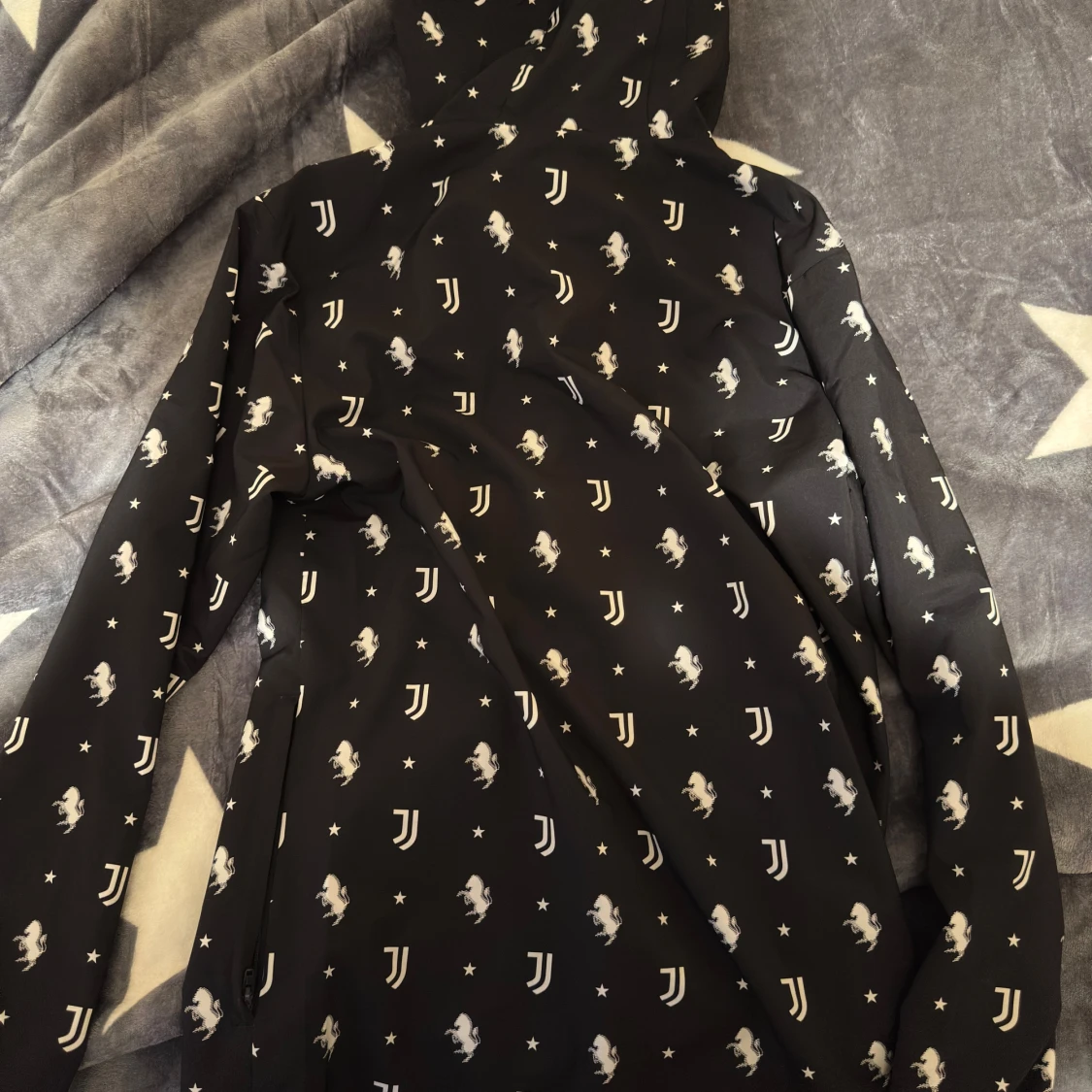Svart vindjacka från Adidas med Juventus-logga, vita stjärnor och hästar över hela jackan. Jackan har huva, hel dragkedja och är tillverkad i lätt polyester. Perfekt för dig som älskar fotboll och vill sticka ut med en sportig look.