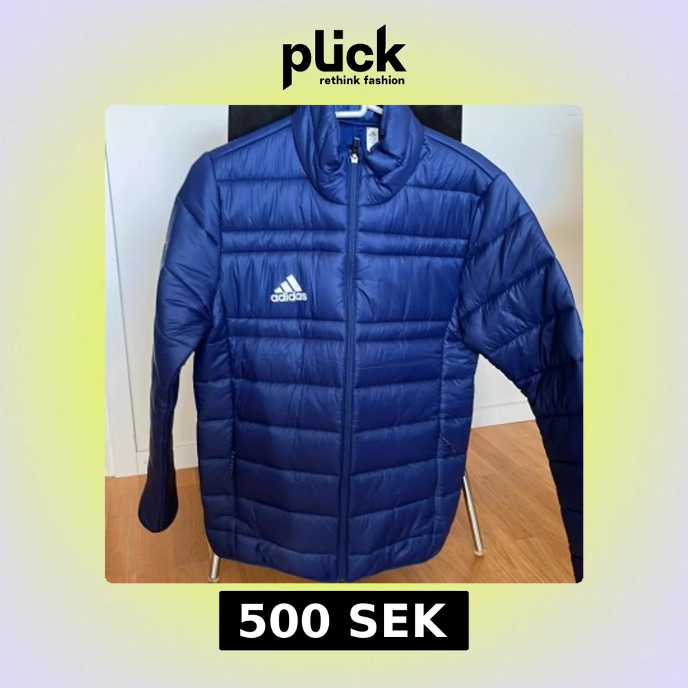 Snygg blå pufferjacka från Adidas, i tunnare modell med klassisk logga på bröstet. Jackan har horisontella quiltade paneler, dragkedja framtill och två sidofickor med dragkedja. Perfekt för kyliga dagar och har en modern, sportig look. Jackan är aldrig använd, så i nyskick.