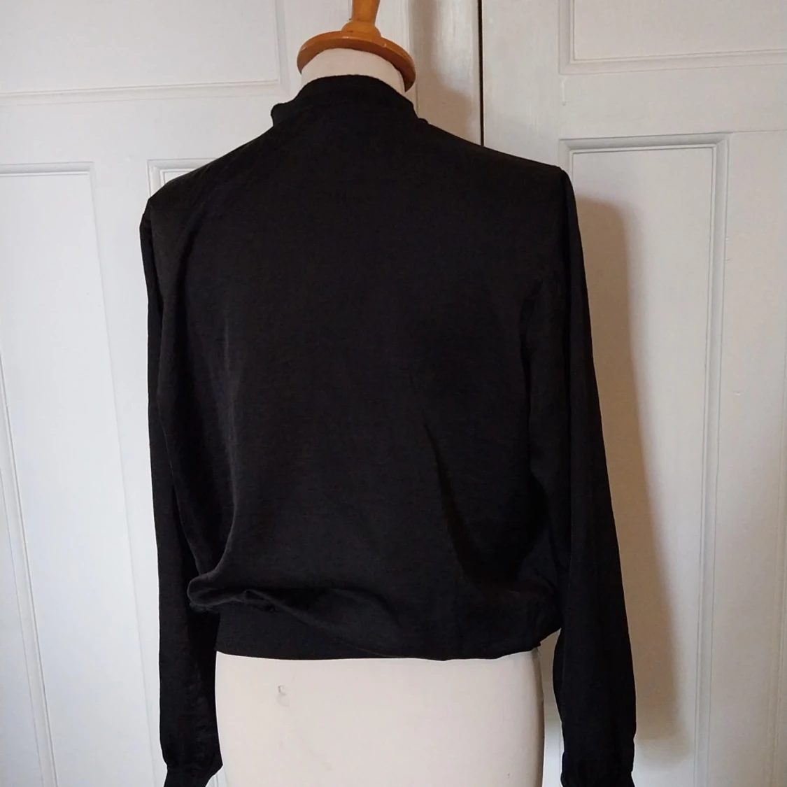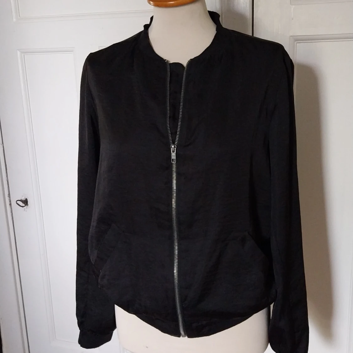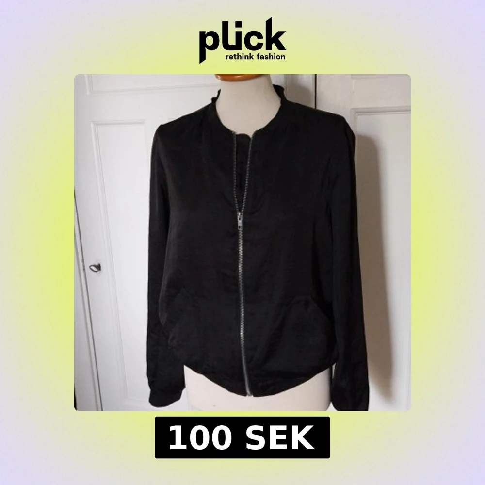 Svart bomberjacka från Åhléns i storlek 40. Jackan har klassisk rundad krage, dragkedja framtill och två snedställda fickor. Tillverkad i ett lätt tyg med ribbade muddar vid hals och ärmslut. Perfekt för en clean och stilren look.
