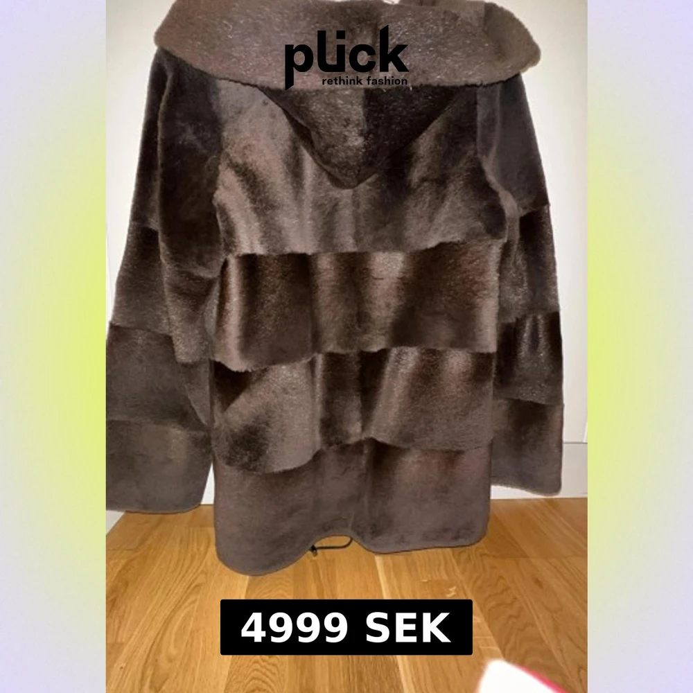 Säljer en brun äkta pälsjacka från Samar med stor huva och breda horisontella paneler. Jackan har knappar framtill och ett rött innerfoder. Den är långärmad och har en loose passform, perfekt för dig som vill ha en varm och snygg look under vintern.