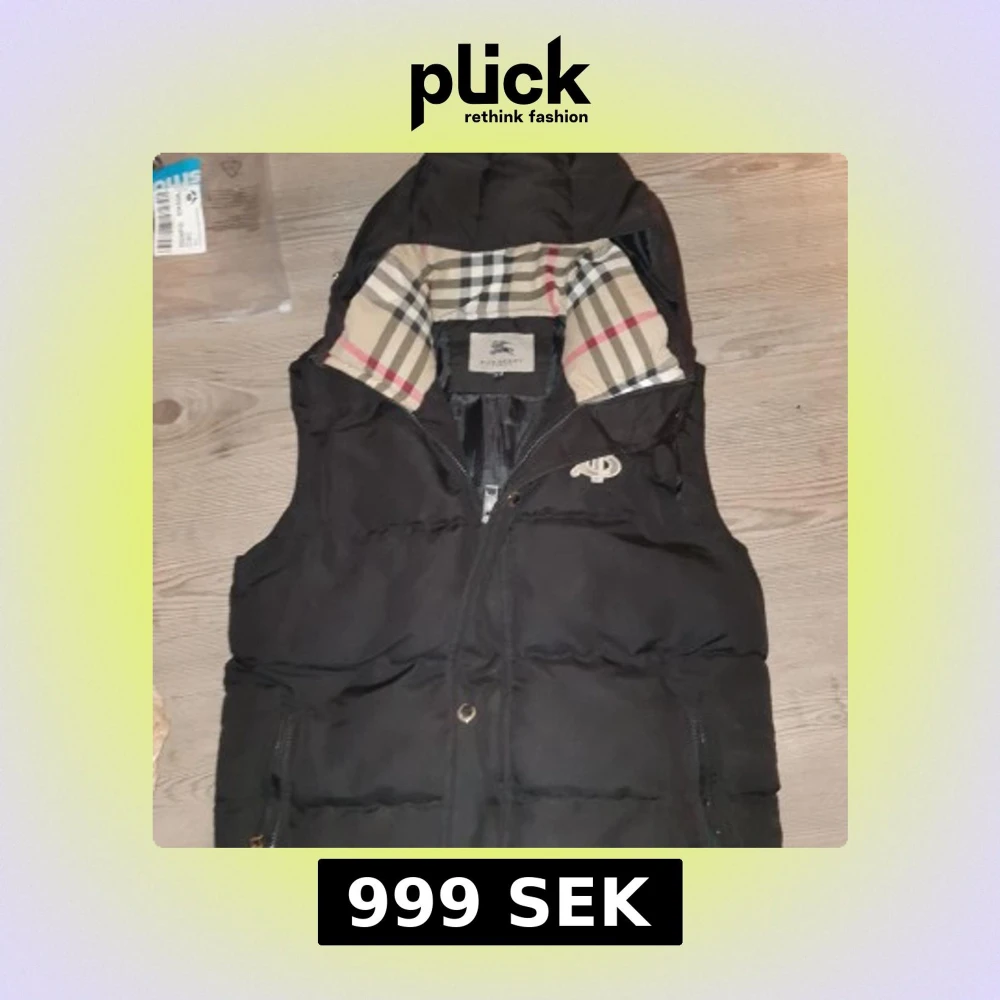 Svart dunväst från Burberry med klassiskt rutigt foder i beige, svart, vitt och rött. Västen har huva, dragkedja framtill och broderad Burberry-logga på bröstet. Perfekt för lager-på-lager och snygg streetstil.