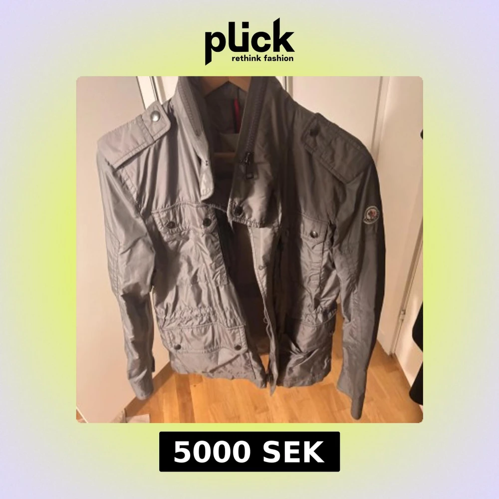 Säljer en stilren grå jacka från Moncler med flera fickor och knappar. Jackan har en hög krage och långa ärmar, perfekt för vår och höst. Den har en diskret logga på ärmen och är tillverkad i ett syntetmaterial. Oanvänd.