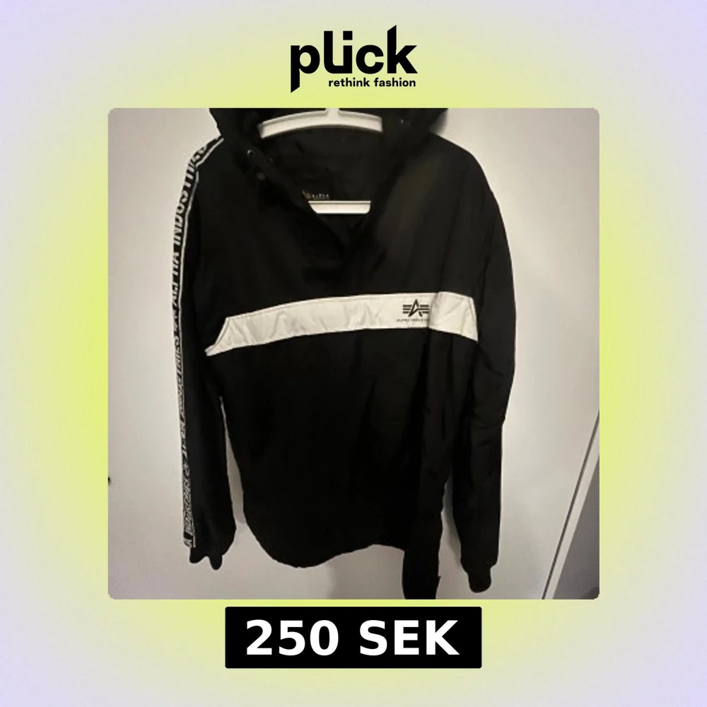 Snygg svart vindjacka från Alpha Industries med vit logga och vit rand över bröstet. Jackan har huva och cool text längs ärmarna. Perfekt för dig som gillar streetwear och vill ha en jacka med attityd.
