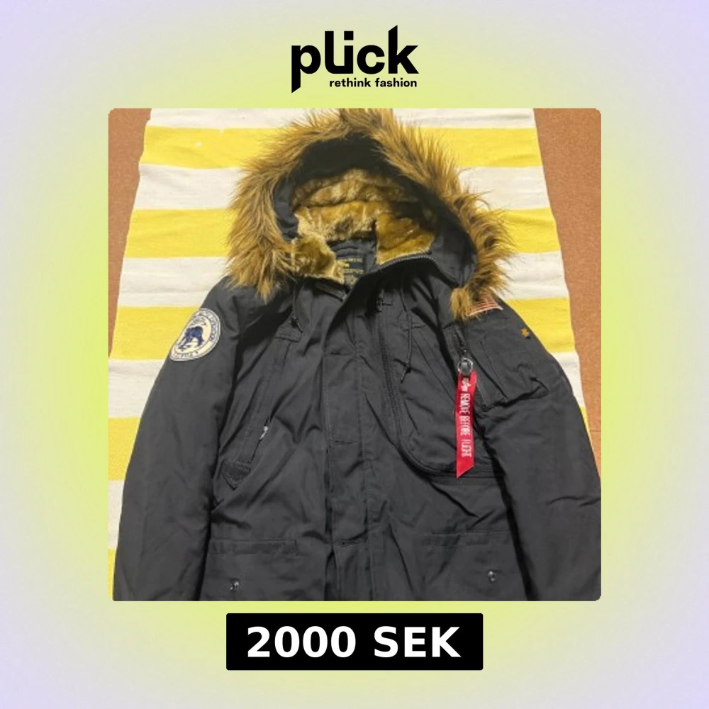 Parkajacka från Alpha Industries i svart med snyggt brunt fuskpälsfoder i huvan. Jackan har flera coola patchar, dragkedja och knappar framtill samt en röd 'Remove Before Flight'-tag på ärmen. Perfekt för kalla dagar med sin varma och fluffiga insida.