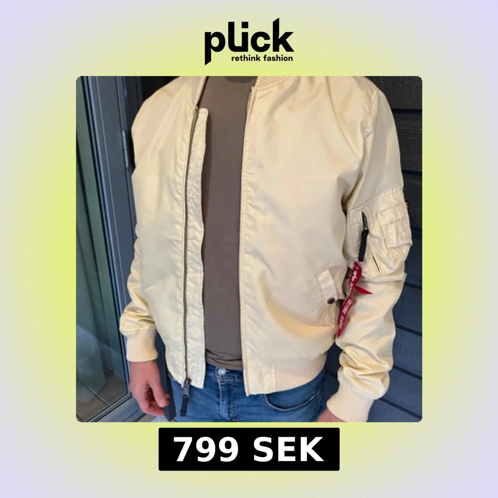 Snygg beige bomberjacka från Alpha Industries med klassisk röd tag på ärmen. Jackan har dragkedja framtill, ribbade muddar och fickor med tryckknapp. Perfekt för dig som vill ha en clean och stilren look. Jackan är i väldigt gott skick.
