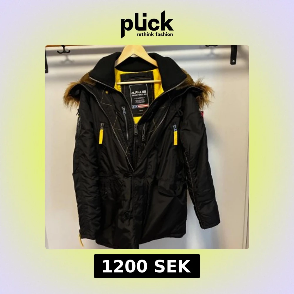 Parkajacka från Alpha Industries i svart med gul quiltad insida. Väldigt varm med många fickor använd max 3 gånger. Storlek M