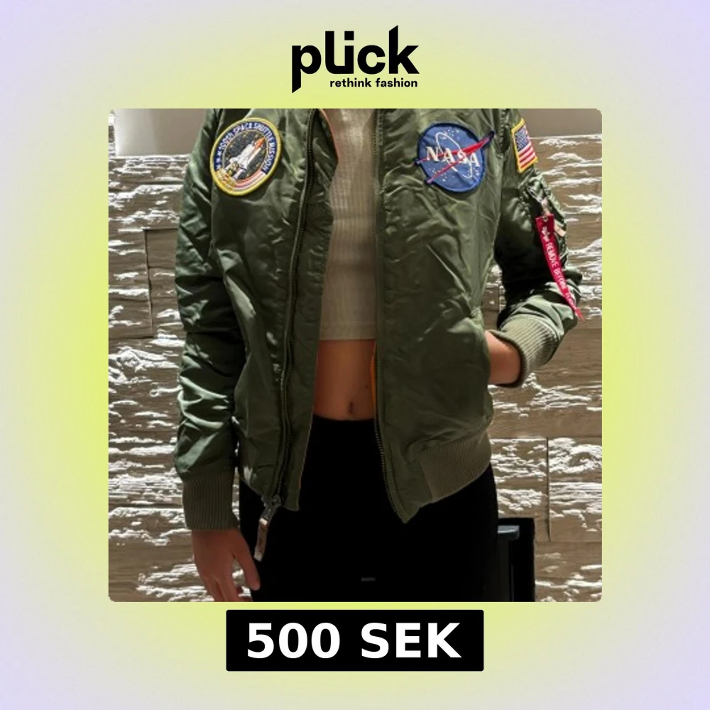 Säljer en grön bomberjacka från Alpha Industries med NASA-patchar och amerikansk flagga på ärmen. Jackan har orange foder, dragkedja framtill och ribbade muddar. Klassisk pilotstil med coola detaljer och ficka på ärmen.