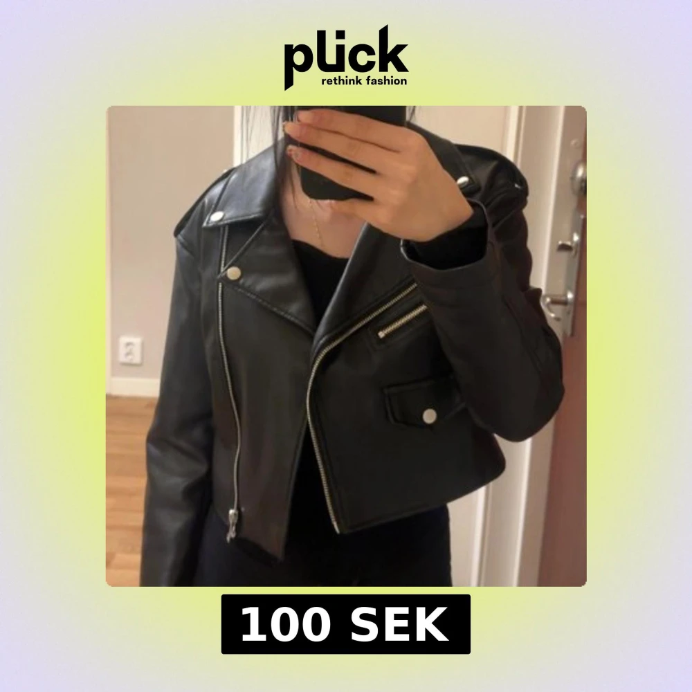 Säljer en svart croppad skinnjacka från Amisu med coola silvriga dragkedjor och knappar. Jackan har klassisk bikerstil med bred krage, fickor med lock och zip samt långärmade ärmar.