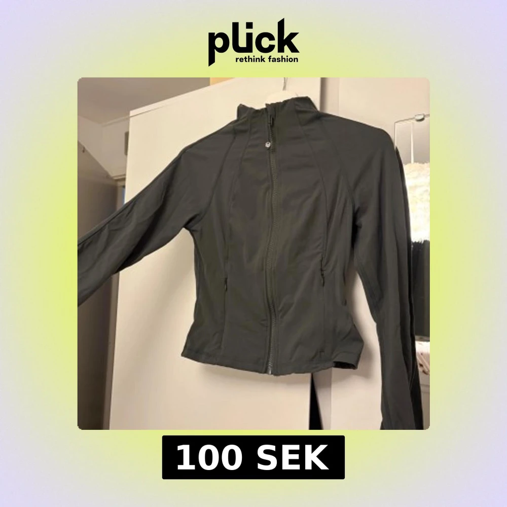 Säljer en grön sportig vindjacka med hel dragkedja framtill och hög krage. Jackan har figurnära passform, långa ärmar och två fickor med dragkedja. Perfekt för dig som gillar en clean och stilren look.