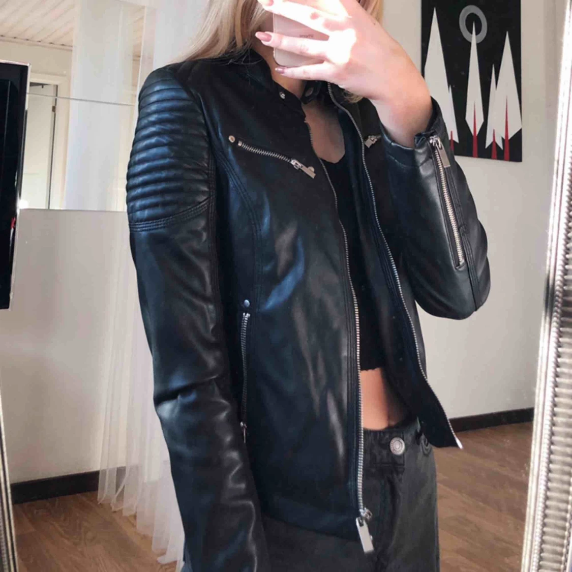Svart bikerjacka i storlek 36, som ny i skicket! Skinn-imitation.