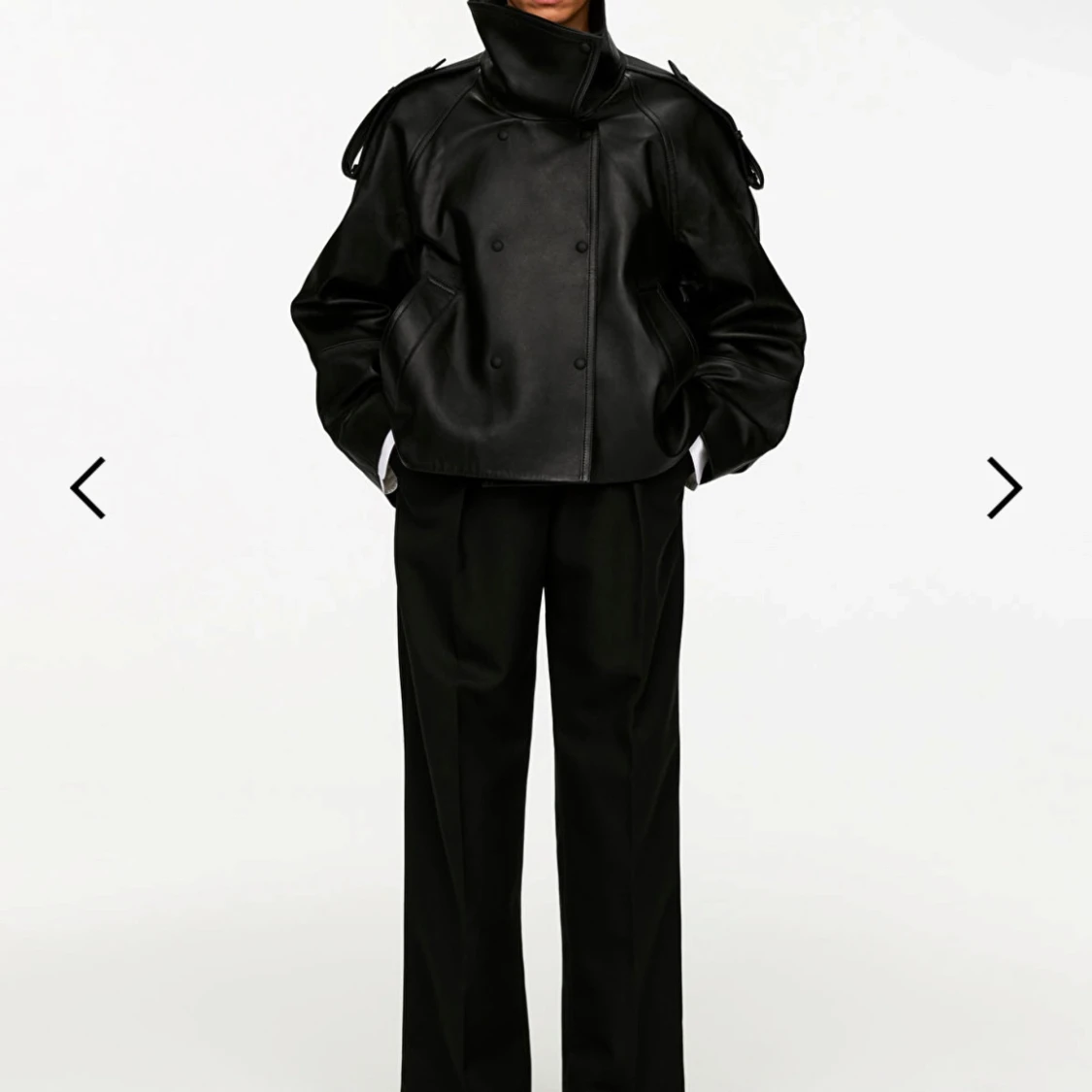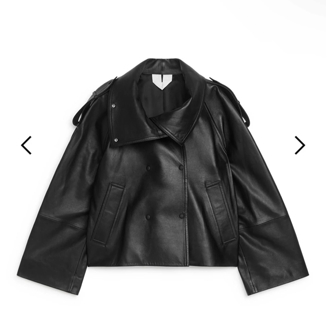 Snygg svart skinnjacka med hög krage och dubbelknäppning. Jackan har en cool oversized passform och långa ärmar. Perfekt för att ge din outfit en edgy touch. Ordinarie pris 7990:- Alla lappar sitter kvar och kvitto finns.