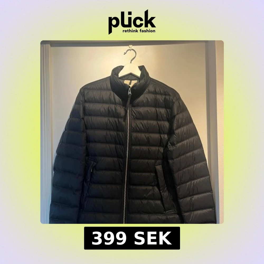 Snygg svart pufferjacka med horisontella sömmar och hög krage. Jackan har hel dragkedja framtill och två fickor på sidorna. Perfekt för höst. Storleken är 48 men känns som 46