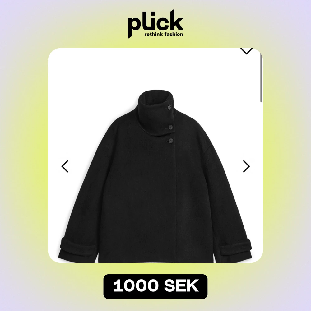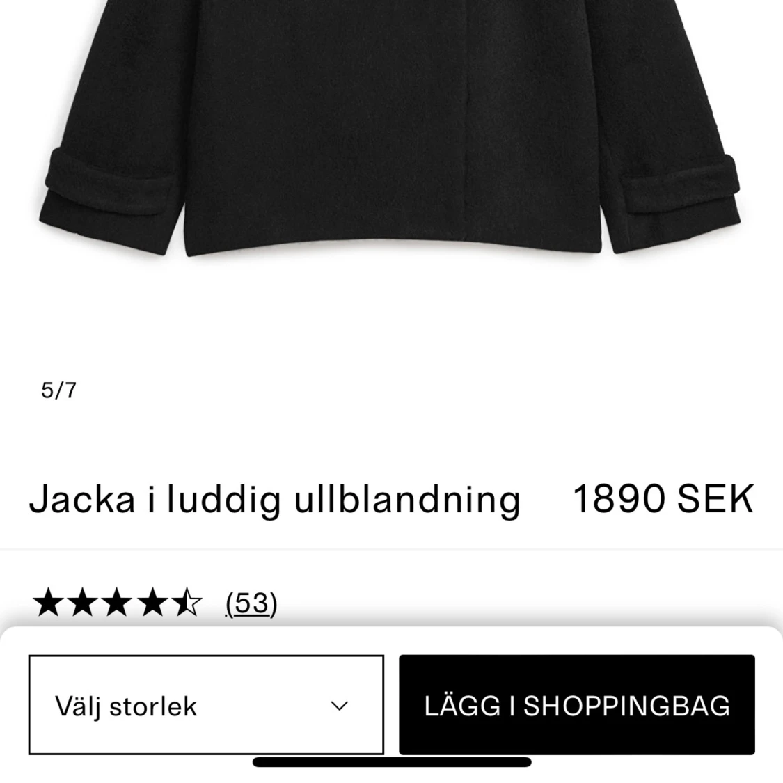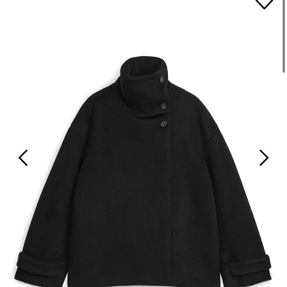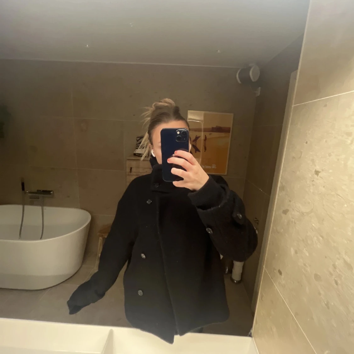 Säljer en stilren svart jacka i luddig ullblandning. Den har en hög krage med knappar och långa ärmar med uppvikta muddar. Perfekt nu till höst/vinter samt våren som kommer. Använd en vinter.