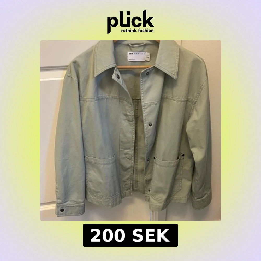 Säljer en ljusgrön jacka med stora framfickor och klassisk krage.