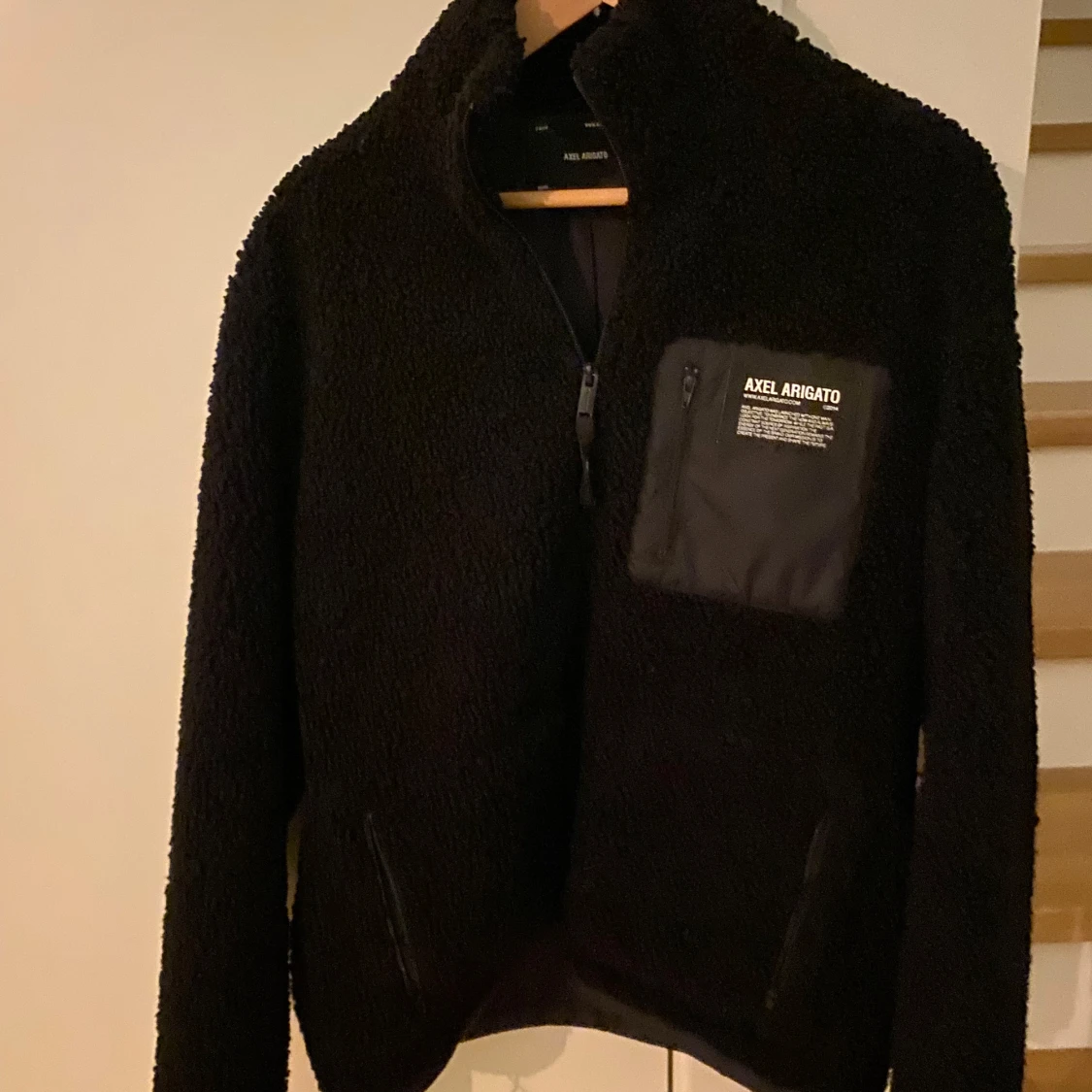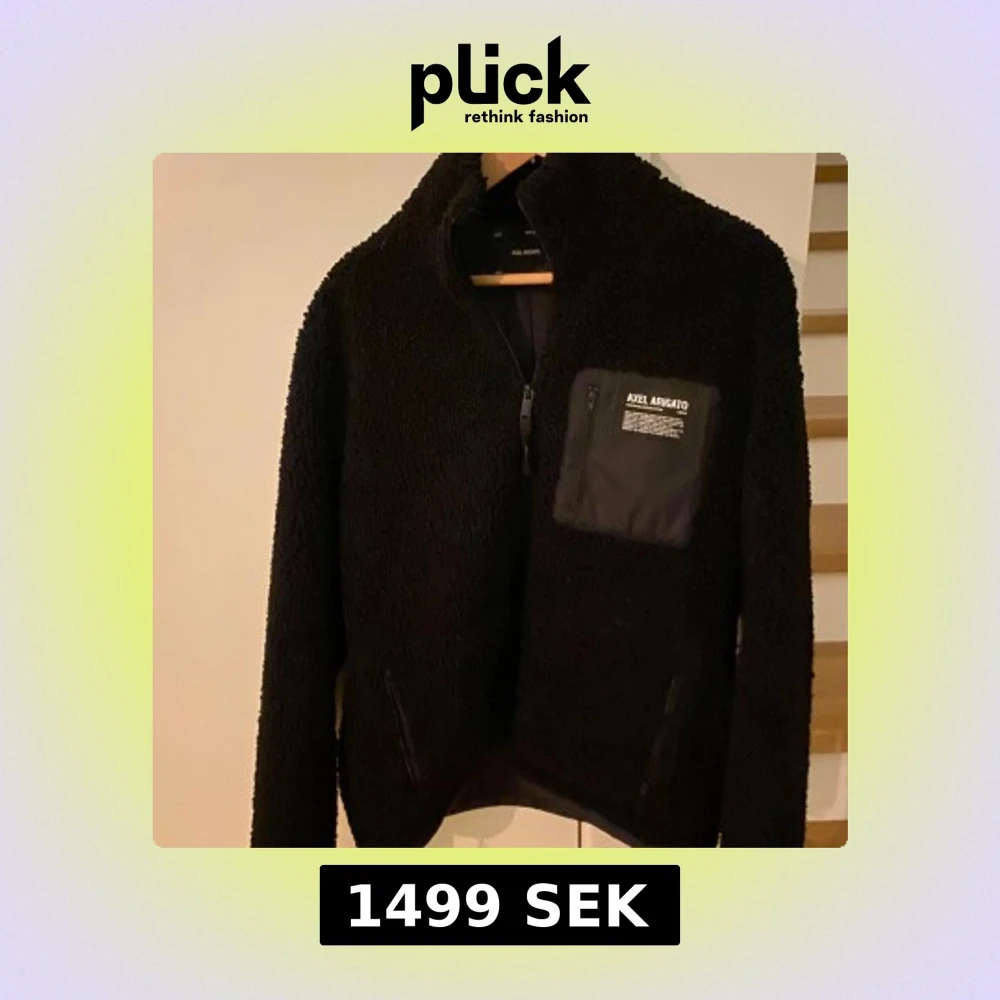 Säljer en svart fleecejacka från Axel Arigato med hög krage och dragkedja. Jackan har en bröstficka med dragkedja och tryckt logga samt två sidofickor. Perfekt för lager-på-lager och chill vardagsstil. Fler bilder kan självklart lösas!