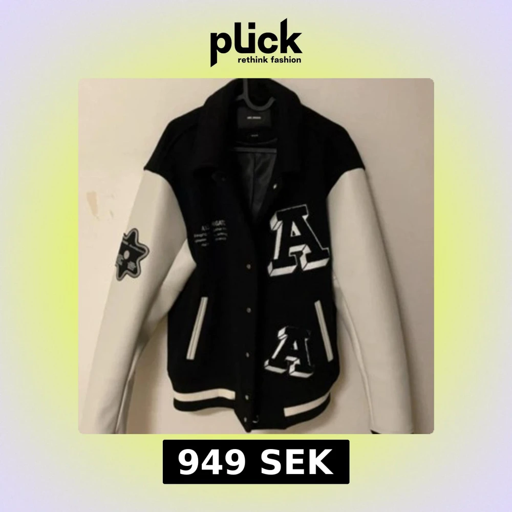 Snygg svart och vit jacka från Axel Arigato med stora bokstäver 'A' på framsidan och 'AXEL' på baksidan. Jackan har långa ärmar och knappar framtill. Perfekt för en cool och avslappnad stil. Är i storlek S men passar M
