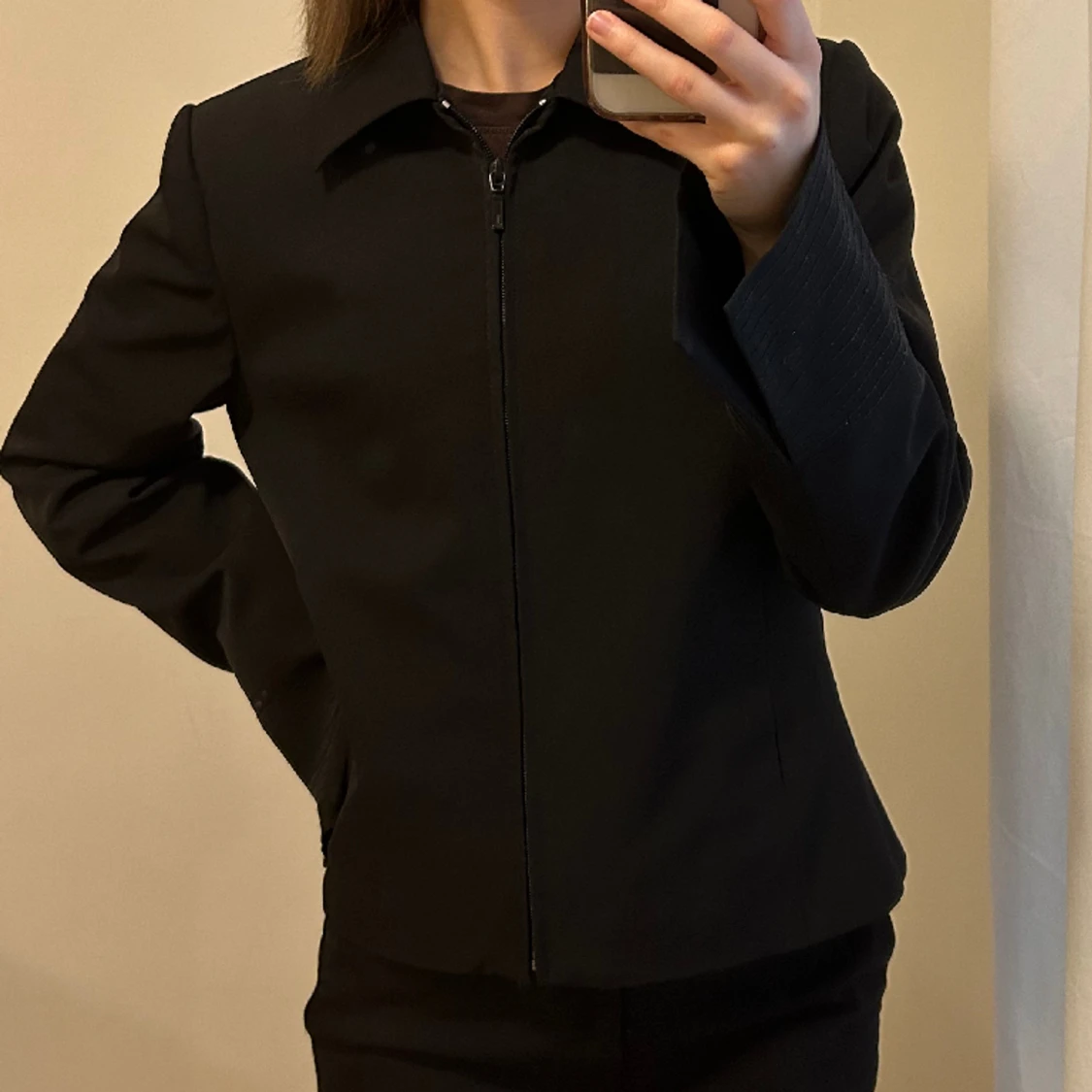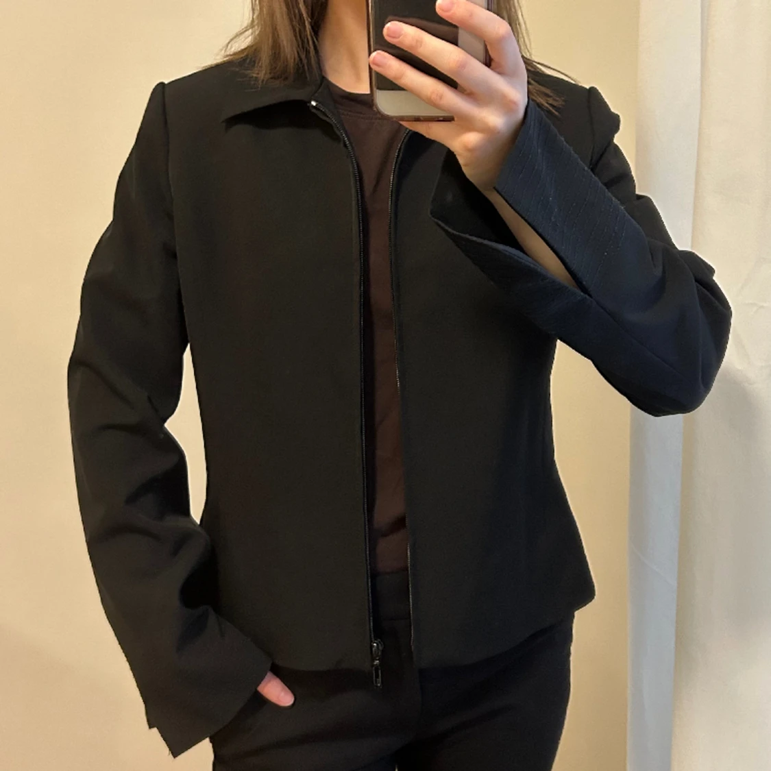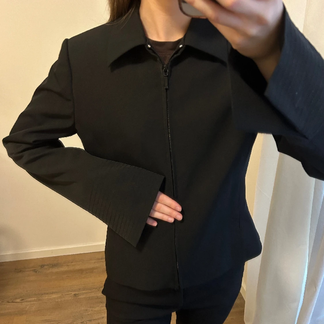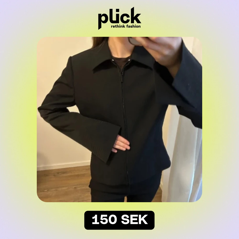 Svart jacka/overshirt i bra kvalite med små axelvaddar och tillhörande skärp. Jag har normalt storlek XS.