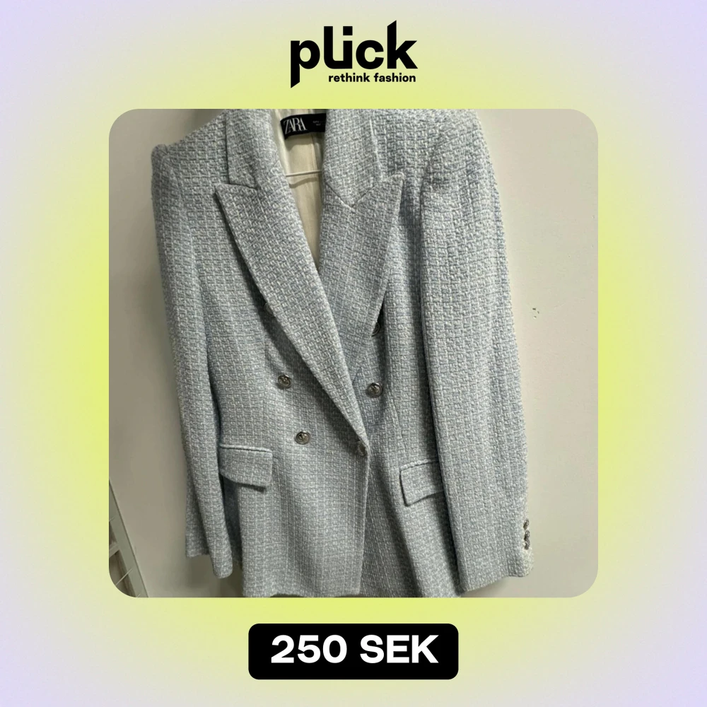 Säljer en elegant babyblåa kavaj från Zara i mycket bra skick. Storlek S, men passar bättre som XS.