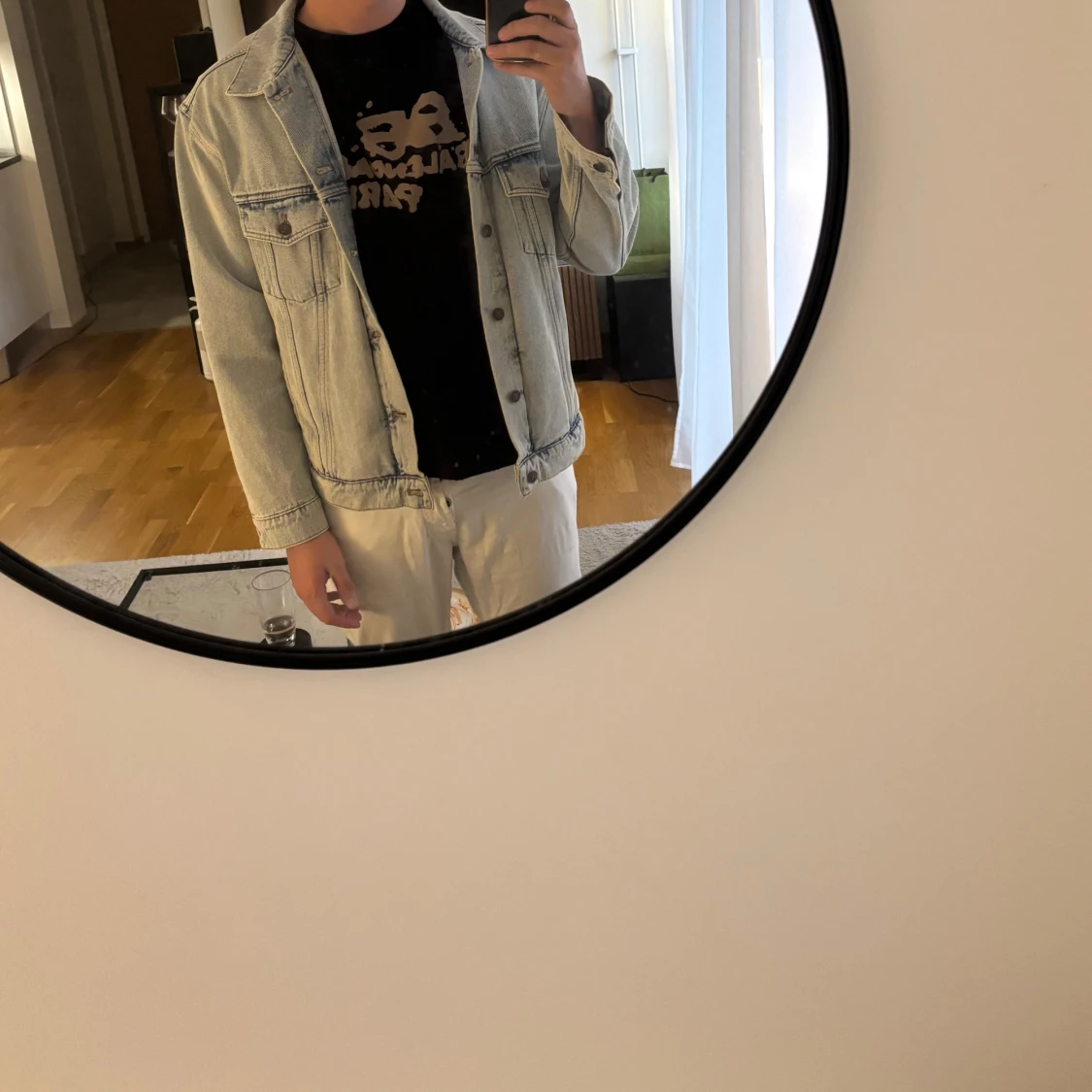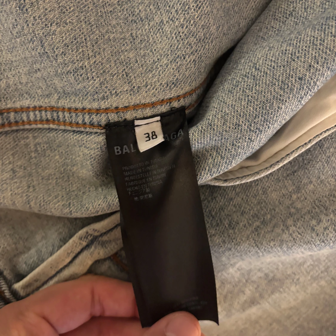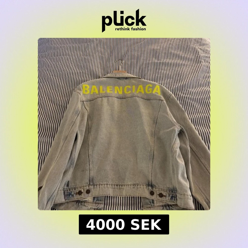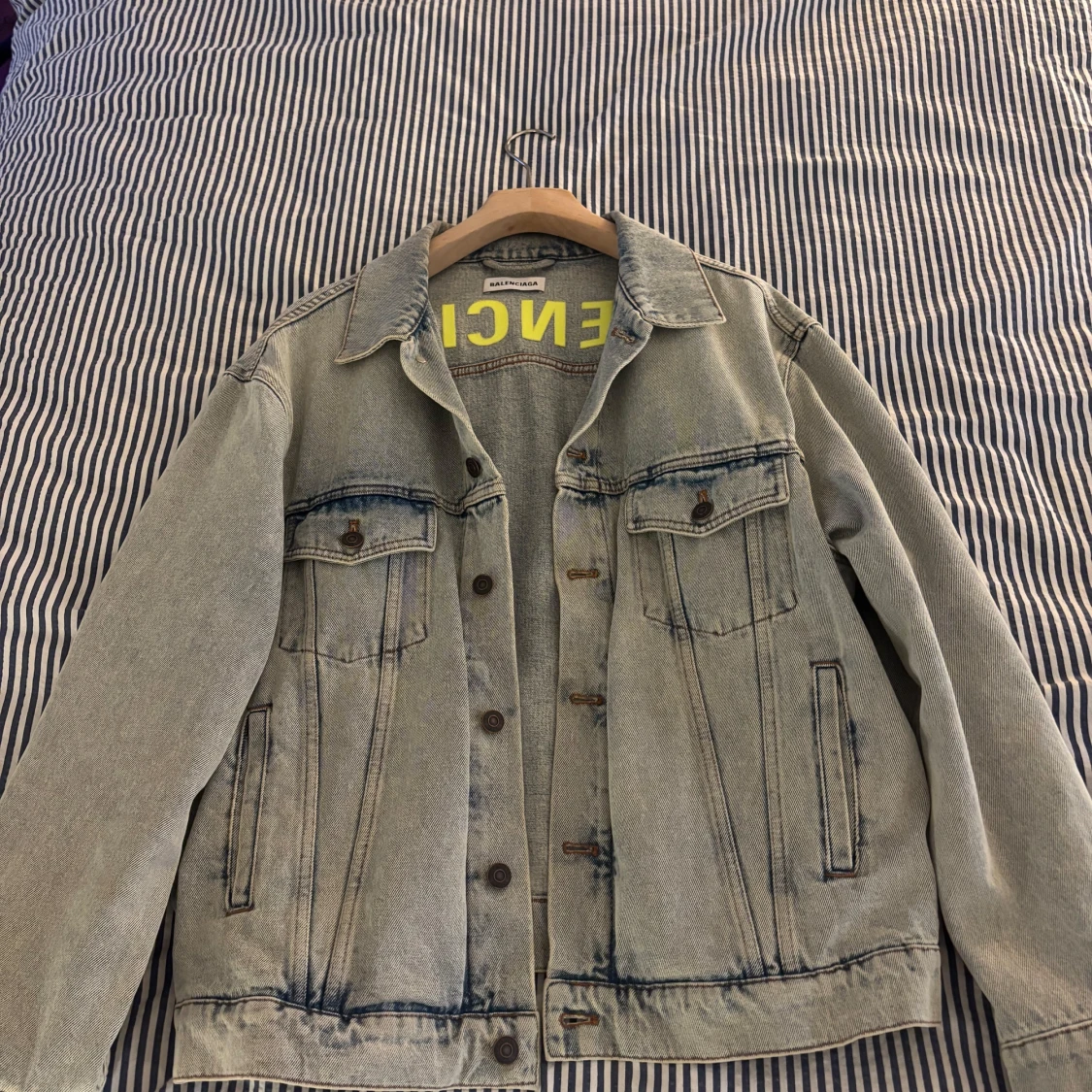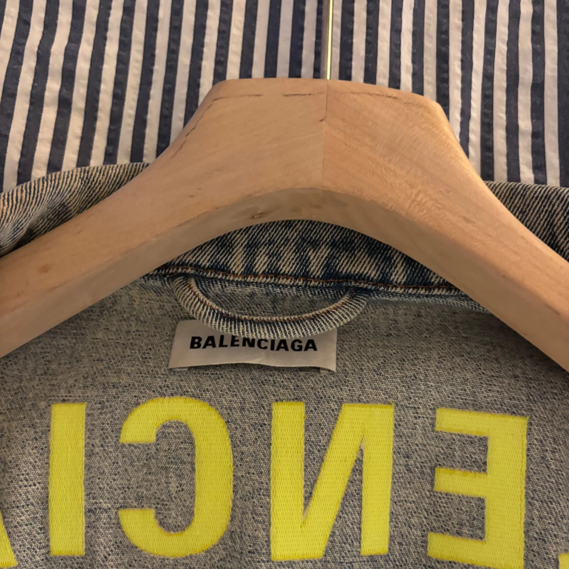 Säljer en ljusblå jeansjacka från Balenciaga med stor gul logga broderad på ryggen. Klassisk modell med knappar framtill, två bröstfickor med lock och två sidofickor. Jackan har en loose fit och är tillverkad i denim, storleken är 38 men sitter mer som en oversized M (se bild) är 188cm 86kg jackan är köpt på Myth o Theresa, kvitto finns!