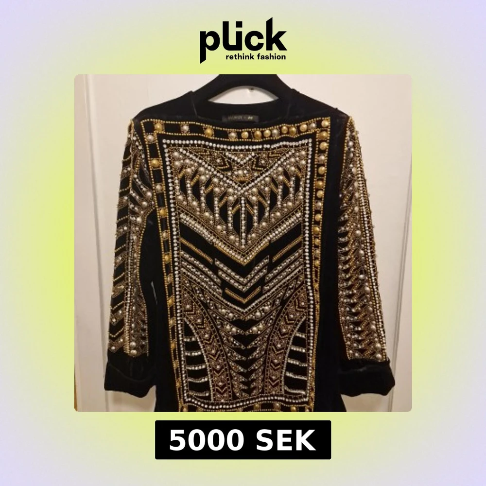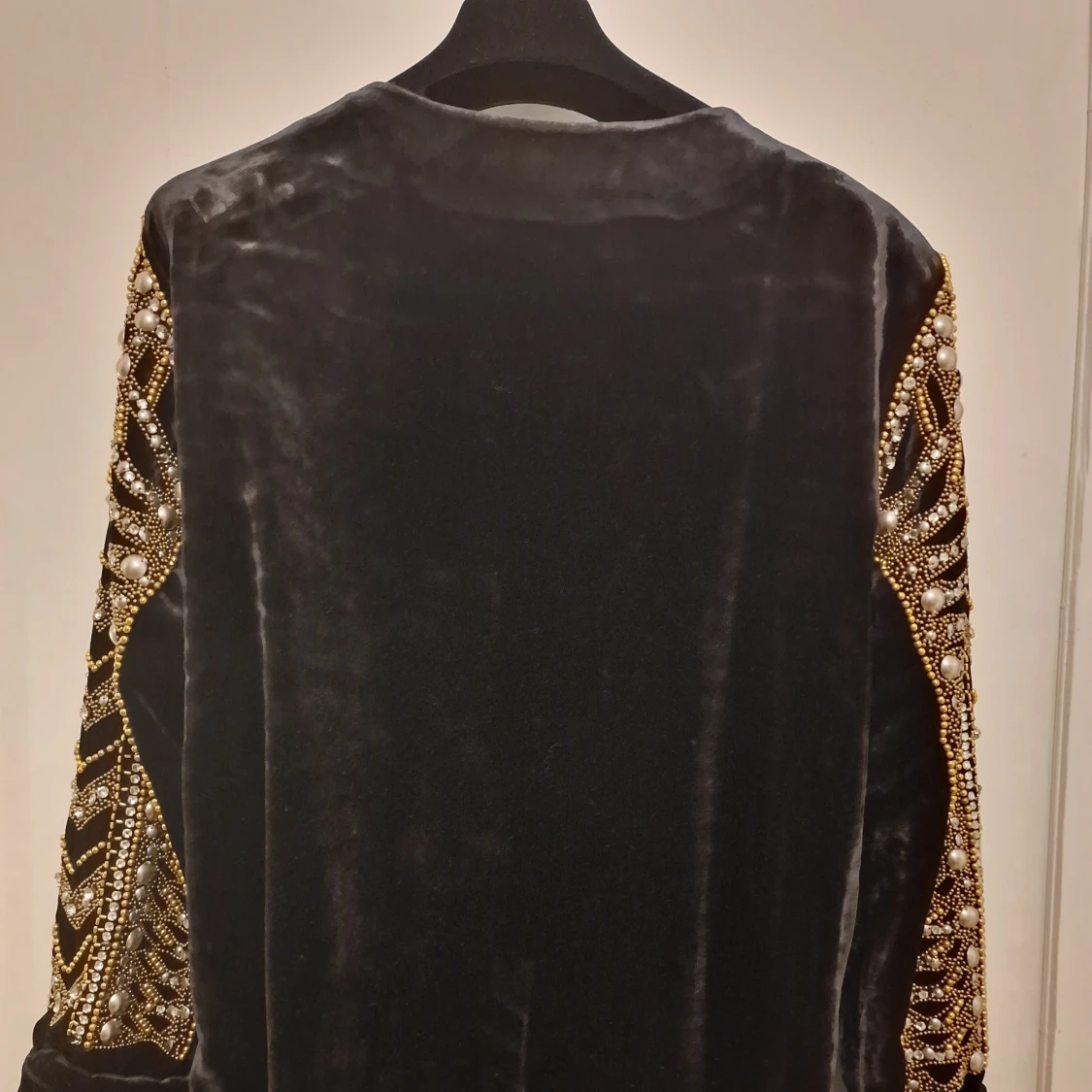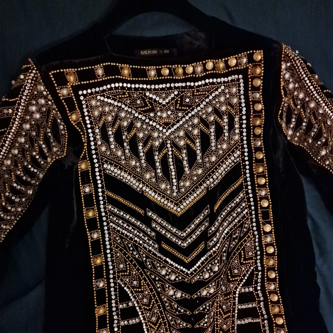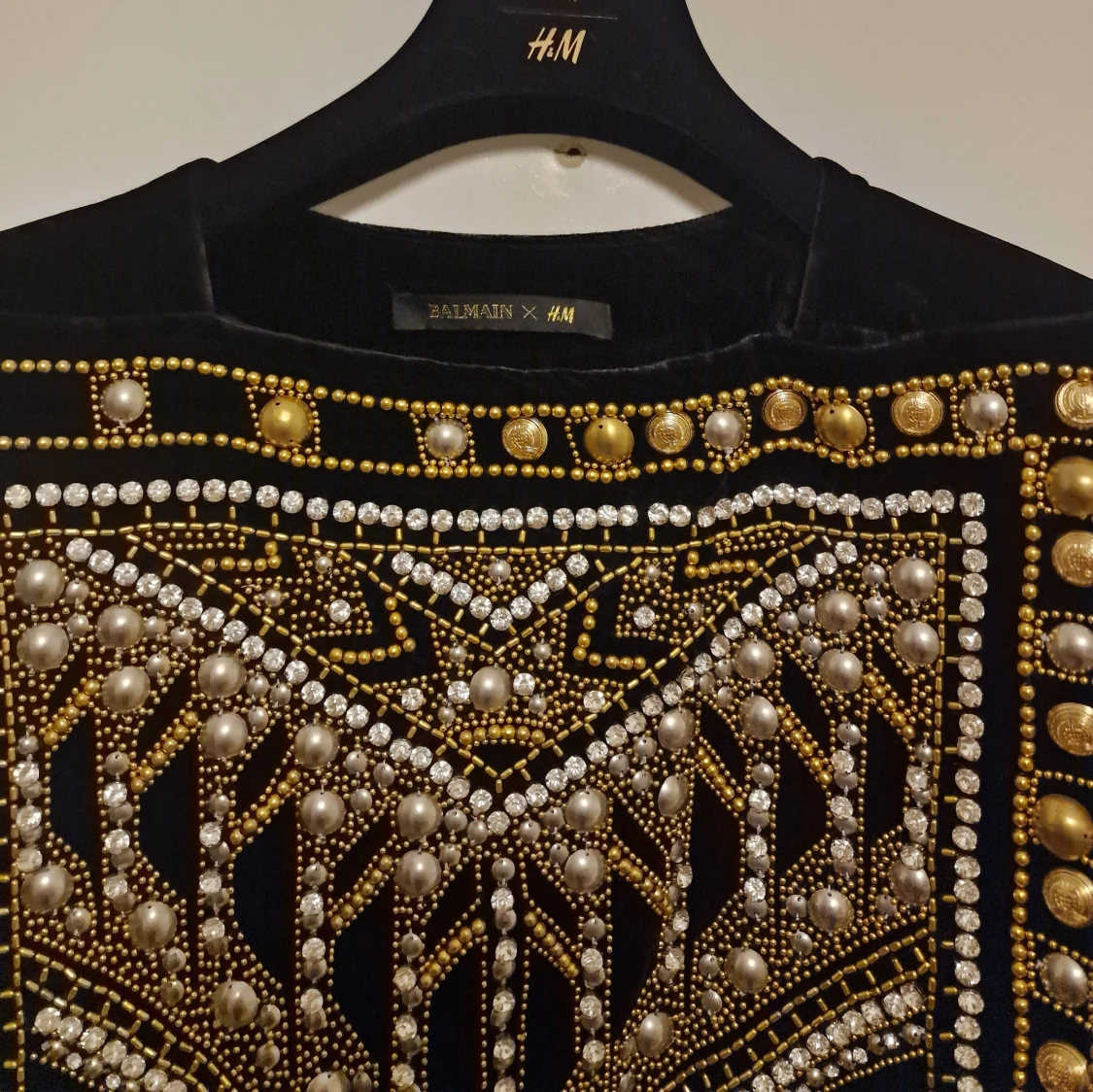 Svart sammetskavaj/blus från Balmain x H&M med galet snygga pärl- och paljettbroderier i guld och silver. Kavajen har markerade axlar och ett riktigt statement-mönster framtill. Perfekt för dig som vill sticka ut och älskar lyxiga detaljer. Använd vid 1 tillfälle.