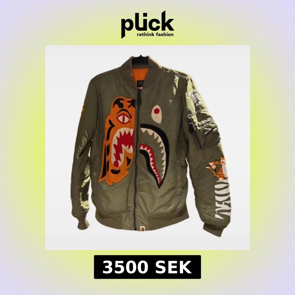 Säljer en grön bomberjacka från BAPE - A Bathing Ape med ikoniska tiger- och hajpatches framtill. Jackan har orange foder, dragkedja, ärmlogga och coola detaljer på ärmen. Tyvärr hål på insidan där hängflärpen brukar vara. Lite tvättludd på muddar.