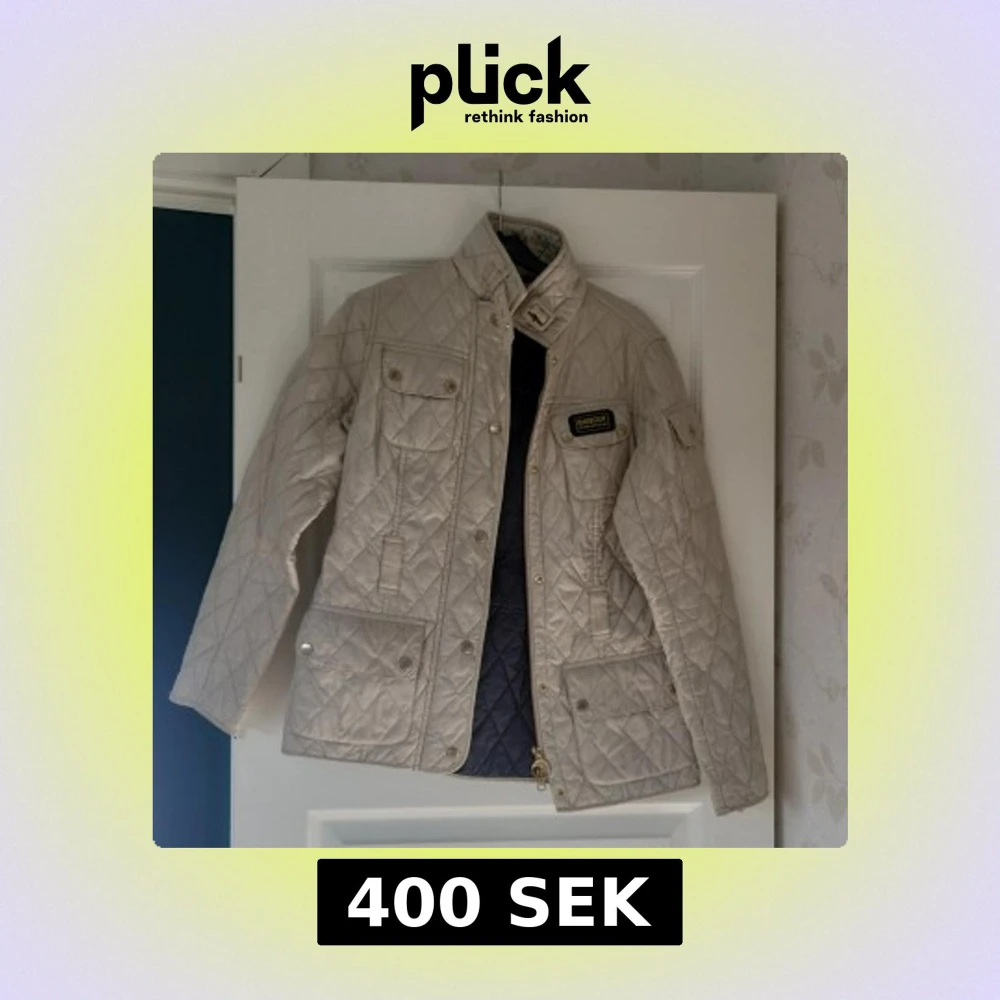 Quiltad beige jacka från Barbour med klassisk design, hög krage med spänne, flera fickor framtill och tryckknappar. Jackan har Barbour-logga på bröstet och är tillverkad i polyester. Perfekt för dig som gillar stilren och tidlös look. Den saknar dock bälte.