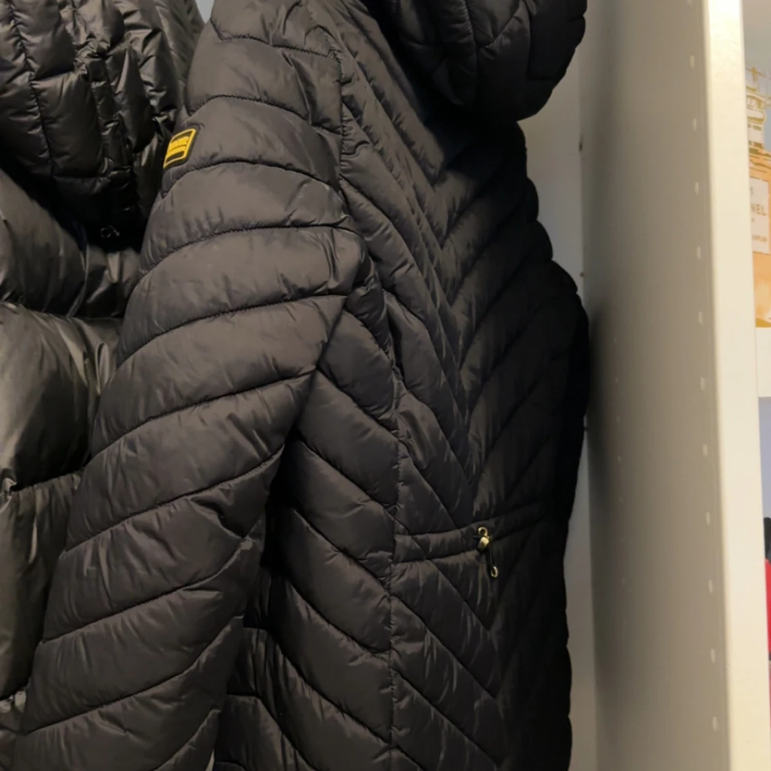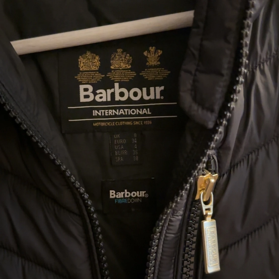Säljer en svart pufferjacka från Barbour International med snygga gulddetaljer på dragkedjan och logga på ärmen. Jackan har huva, quiltad design och dragkedja framtill. Perfekt för kalla dagar och riktigt stilren look. Har knappt använt den