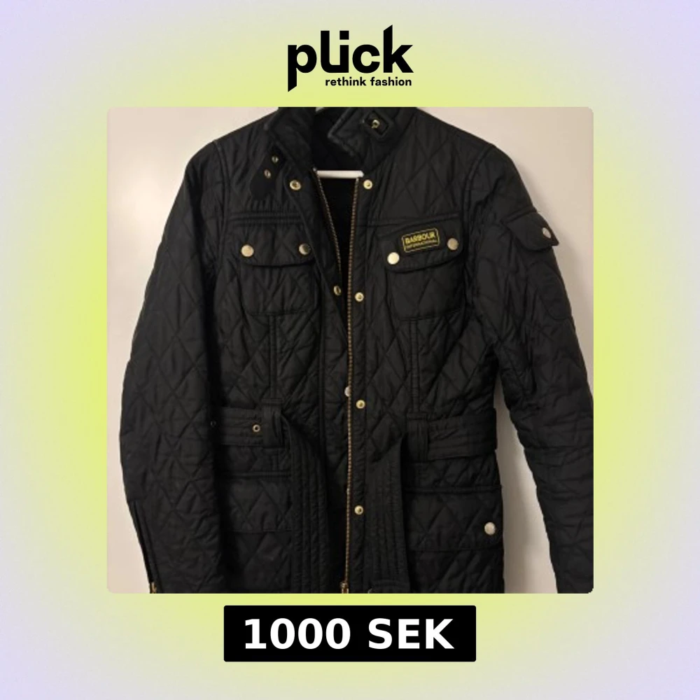 Svart quiltad jacka från Barbour International med guldiga detaljer, bälte i midjan och flera fickor med tryckknappar. Klassisk design med hög krage och dragkedja framtill. Perfekt för dig som gillar stilren och tidlös look.