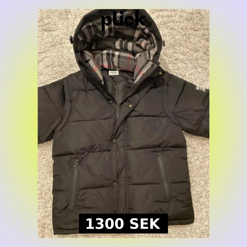 Svart pufferjacka från Burberry med avtagbara ärmar, så du kan använda den som väst. Jackan har huva med grått, rött och svart rutigt foder, två fickor med dragkedja och knäppning framtill. Perfekt för kalla dagar och riktigt snygg stil.