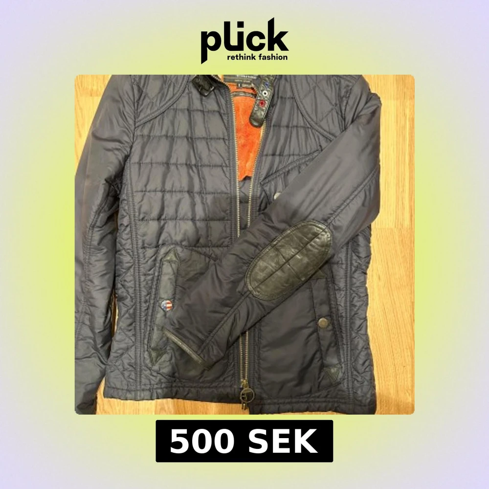 Säljer en mörkblå quiltad jacka från Barbour med dragkedja och knappar. Jackan har långärmade ärmar med svarta skinnlappar på armbågarna och två fickor framtill. Snygga detaljer och klassisk design.