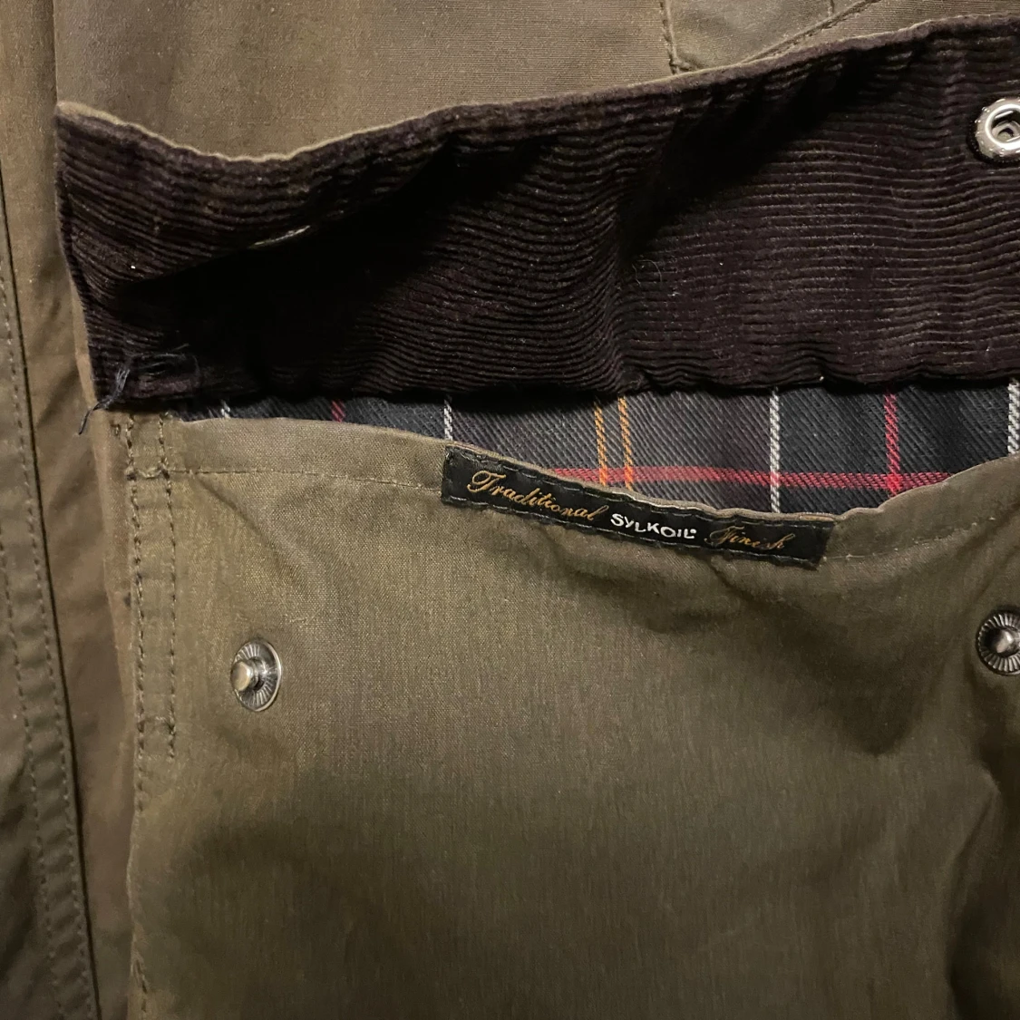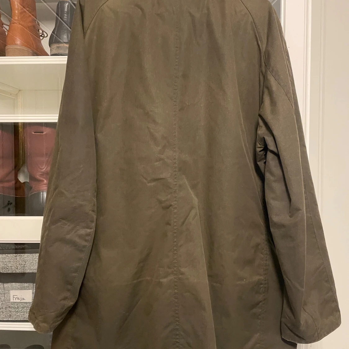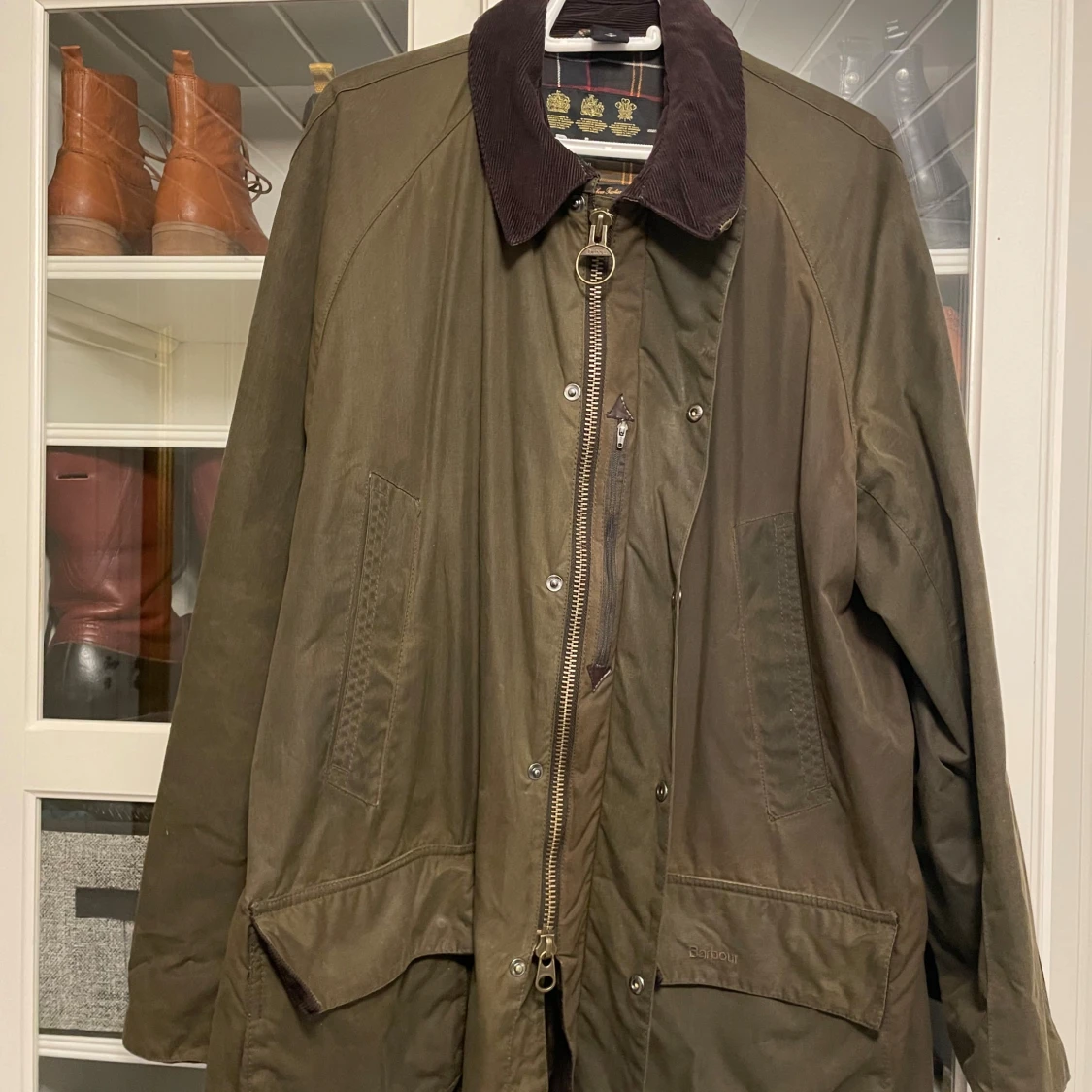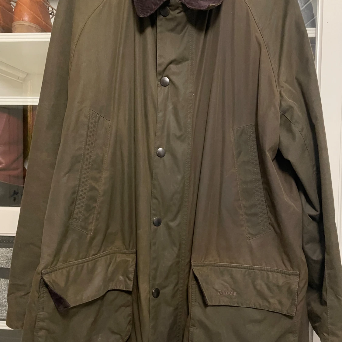 Använd fåtal gånger, inköpt för 4000kr. Klassisk olivgrön oljerock från Barbour med brun manchesterkrage, stora fickor och dragkedja med knappar, Perfekt för höst och vinter, loose fit och långärmad modell.