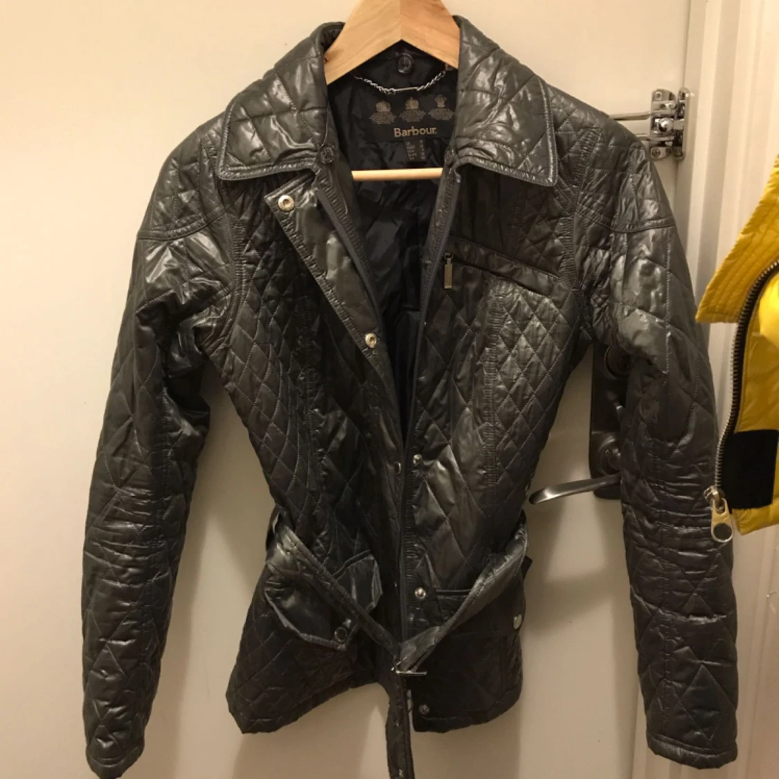 Klassisk Barbourjacka med bälte i midjan. Grå glansig. Nyskick!