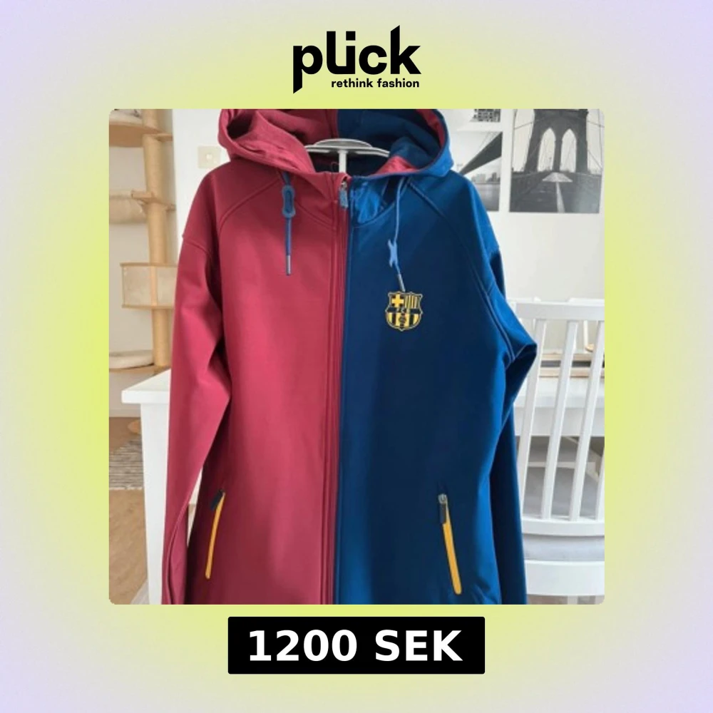Snygg vindjacka från FC Barcelona i tvådelad design med vinröd och mörkblå färg. Jackan har huva, dragkedja, gula detaljer på fickorna och klubbens emblem på bröstet. Materialet är polyester och jackan har normal passform. Perfekt för dig som älskar fotboll och Barça.köpt i Barcelona vid Camp Nou. Helt ny med tagg.
