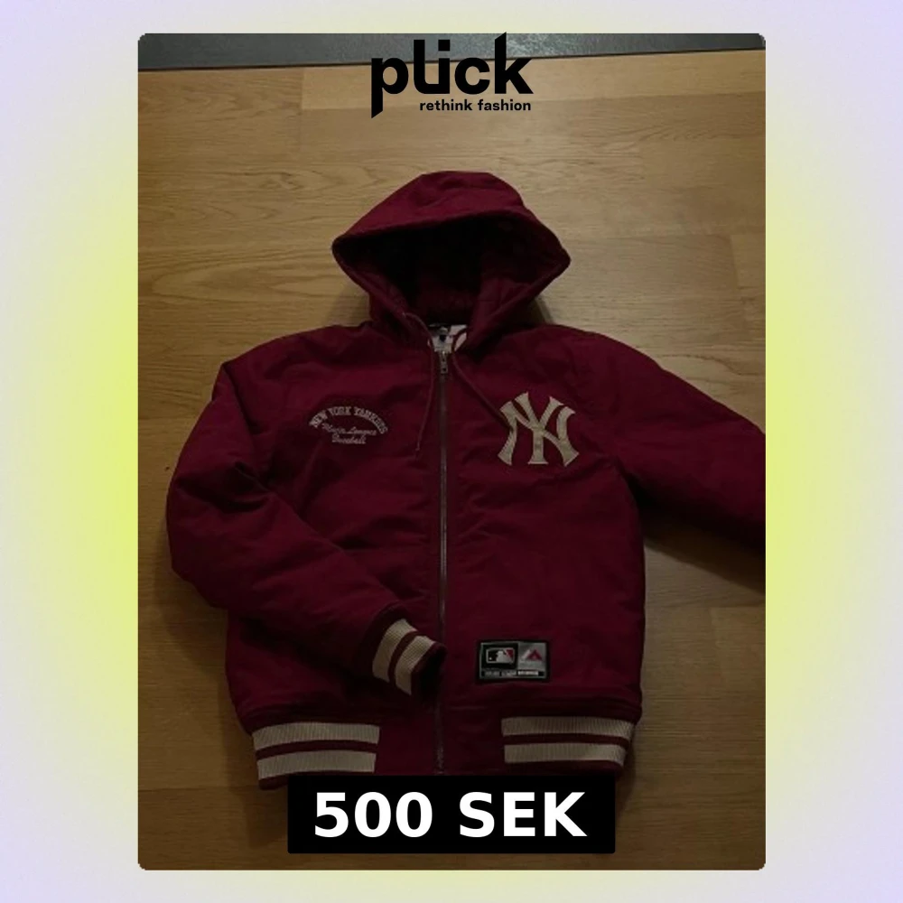 Helt oanvänd röd Majestic Athletic jacka i fint skick. Broderade loggor, ribbade muddar, samt quiltat foder. Storlek small.