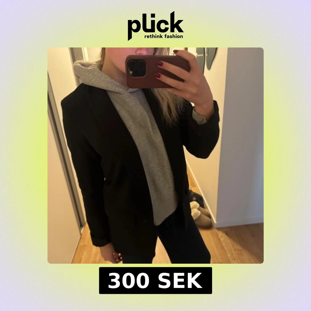 Snygg svart kavaj med klassisk krage och raka linjer. Kavajen har lång ärm och en stilren look som passar perfekt till hoodie eller skjorta. Enkel design utan synliga detaljer som knappar eller bälte. Perfekt för dig som gillar en clean och tidlös stil.