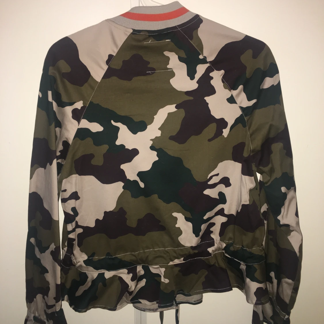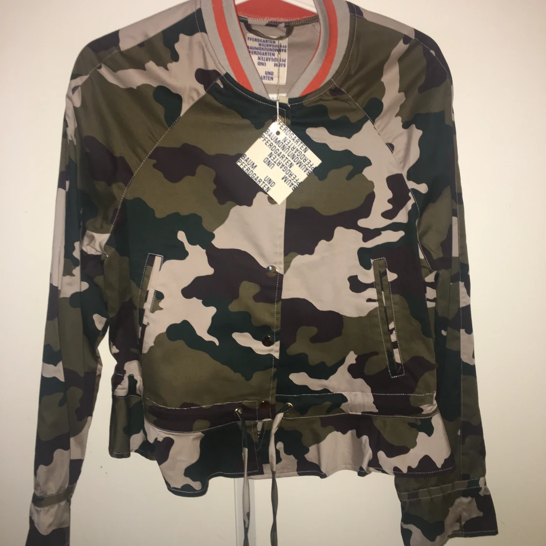 En tunn jacka från Baum und Pferdgarten storlek i storlek 36. Kamouflage/militär mönstrad. Den har snörning vid midjan, blir lite peplum när man knyter den. Aldrig använd, ny med prislapp kvar. Säljer för 900kr inkl frakt, nypriss 1999kr